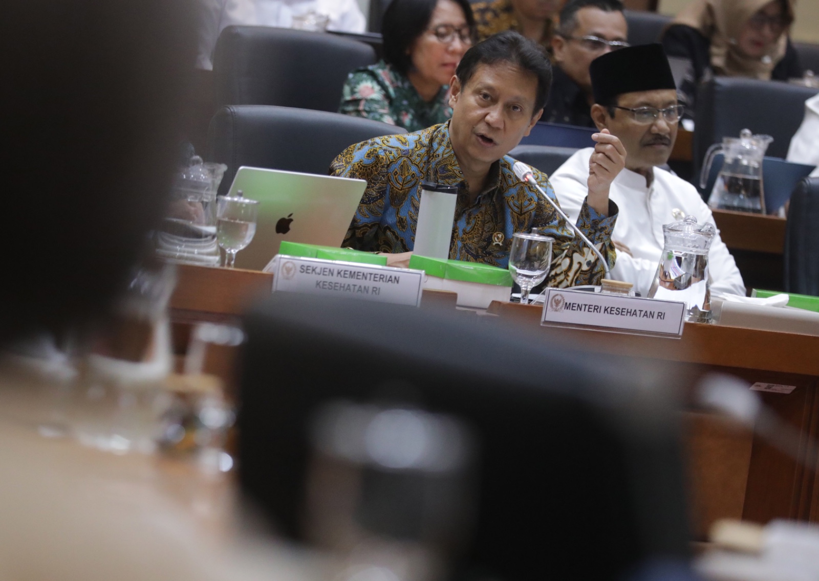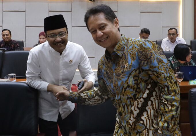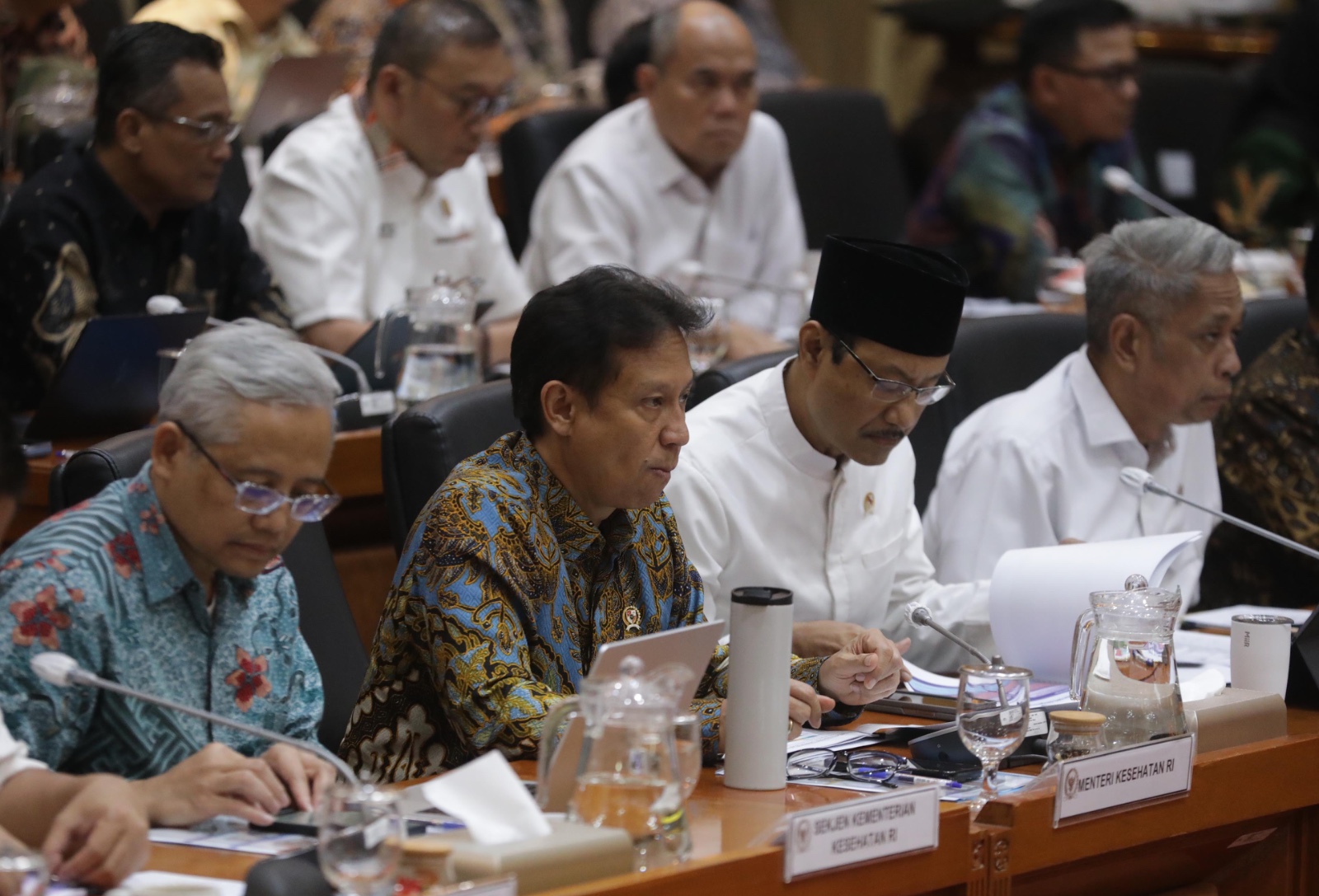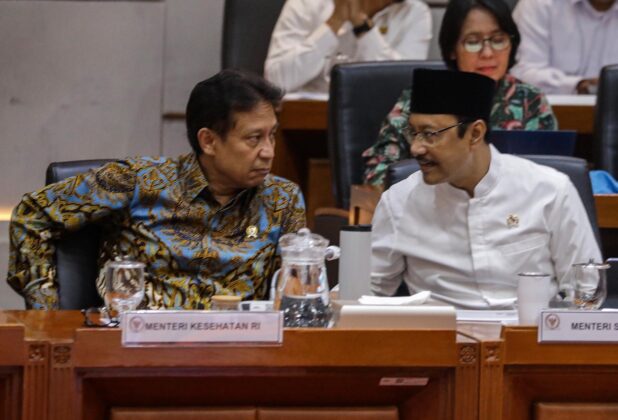 Menteri Kesehatan Budi Gunadi Sadikin (kiri) bersama Menteri Sosial Saifullah Yusuf (kanan) saat mengikuti rapat kerja dengan Komisi IX DPR di Kompleks Parlemen, Senayan, Jakarta, Rabu (15/4/2026). Aktual/TINO OKTAVIANO