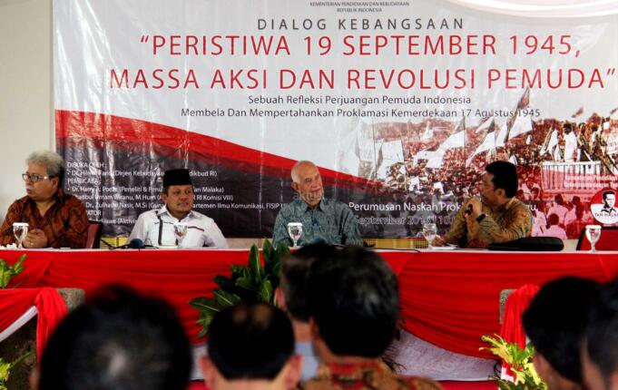 Kanan-kiri ; Guru Besar Departemen Ilmu Komunikasi Fisip UI Zulhasril Nasir, Anggota DPR RI Komisi VIII Khatibul Umam Wiranu, Peneliti dan penulis Biografi Tan Malaka Harry A Pouze, Ketua Majelis Jaringan Pro Demokrasi Bob Randilawe dalam dialog Kebangsaan Peristiwa 19 September 1945 , Massa Aksi dan Revolusi Pemuda di Museum Perumusan Naskah Proklamasi, Jakarta, Minggu (18/9/2016). Dialog kebangsaan yang diselenggarakan oleh Direktorat Jenderal Kebudayaan Kemendikbud RI dan Tan Malaka Institute, sebagai refleksi perjuangan pemuda Indonesia membela dan mempertahankan Proklamasi Kemerdekaan 17 Agusutus 1945. AKTUAL/MUNZIR