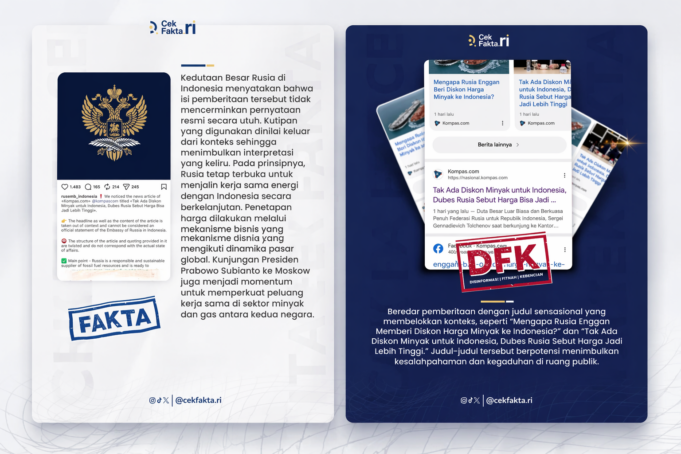 “Pada prinsipnya, Rusia tetap terbuka untuk menjalin kerja sama energi dengan Indonesia secara berkelanjutan. Penetapan harga dilakukan melalui mekanisme bisnis yang mengikuti dinamika pasar global,” demikian keterangan akun Instagram Cek Fakta RI, dikutip pada Minggu (19/4).