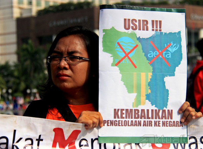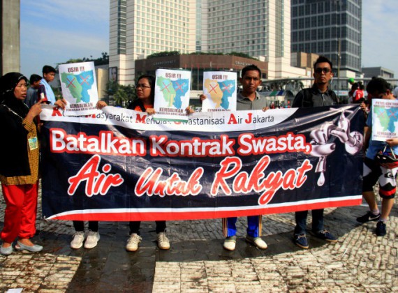Aktivis Koalisi Masyarakat Menolak Swastanisasi Jakarta (KMMSAJ) melakukan aksi Menolak Swastanisasi Air Jakarta di Bunderan HI, Jakarta, Minggu (22/3/2015). Dalam aksinya massa menuntut agar Kembalikan Pengelolaan Air kepada Negara. AKTUAL/MUNZIR