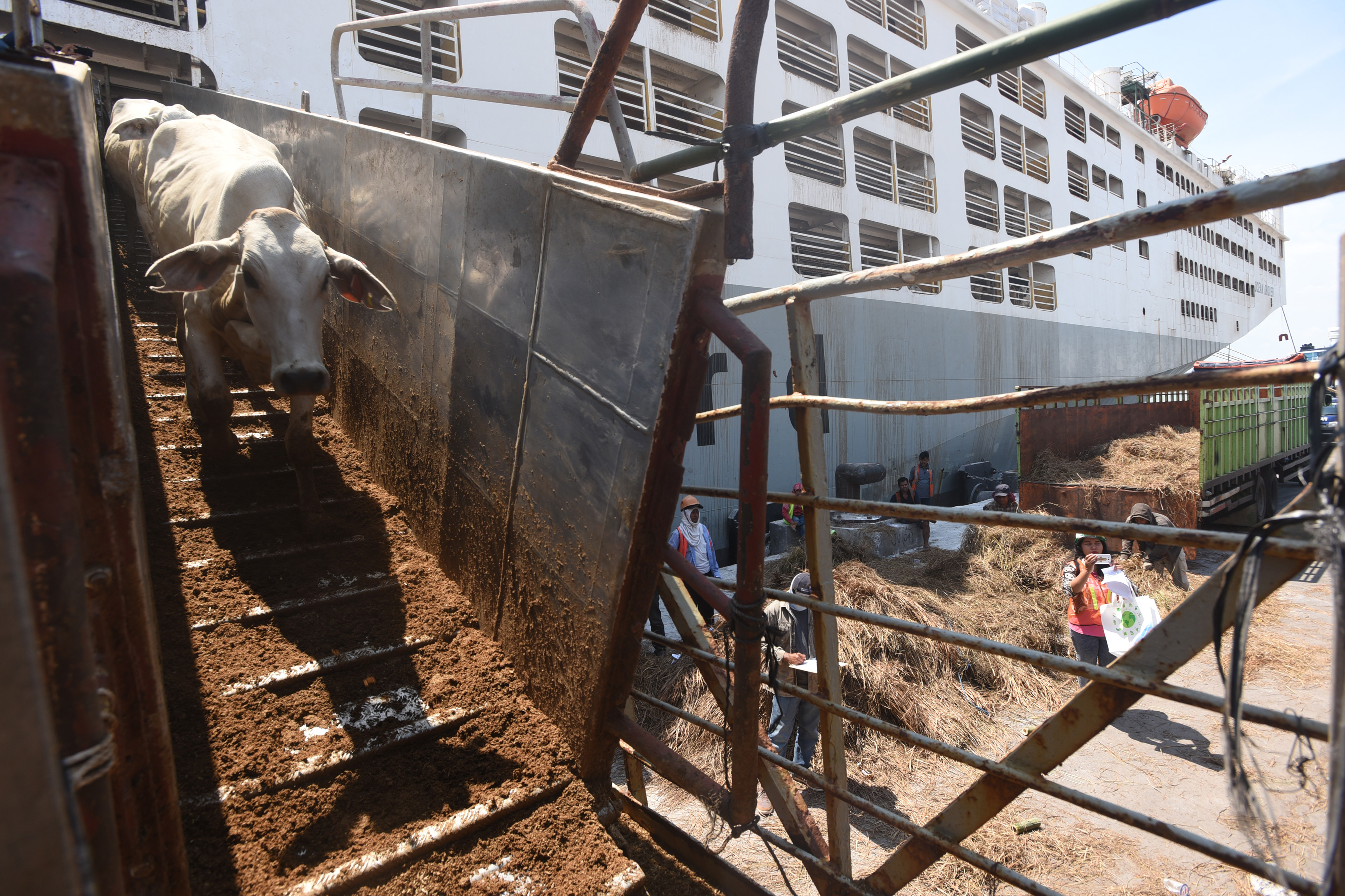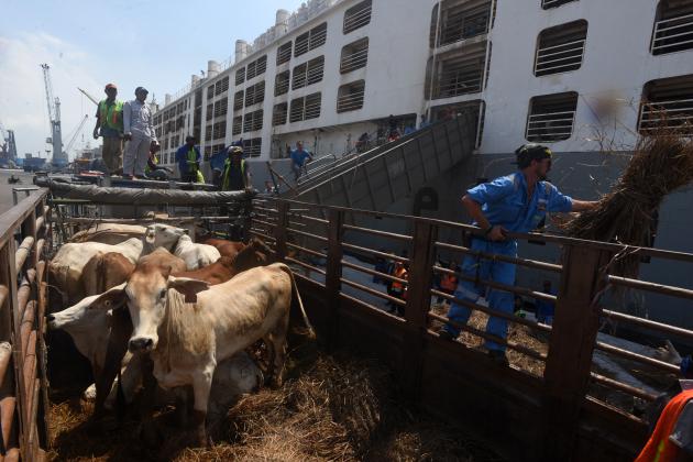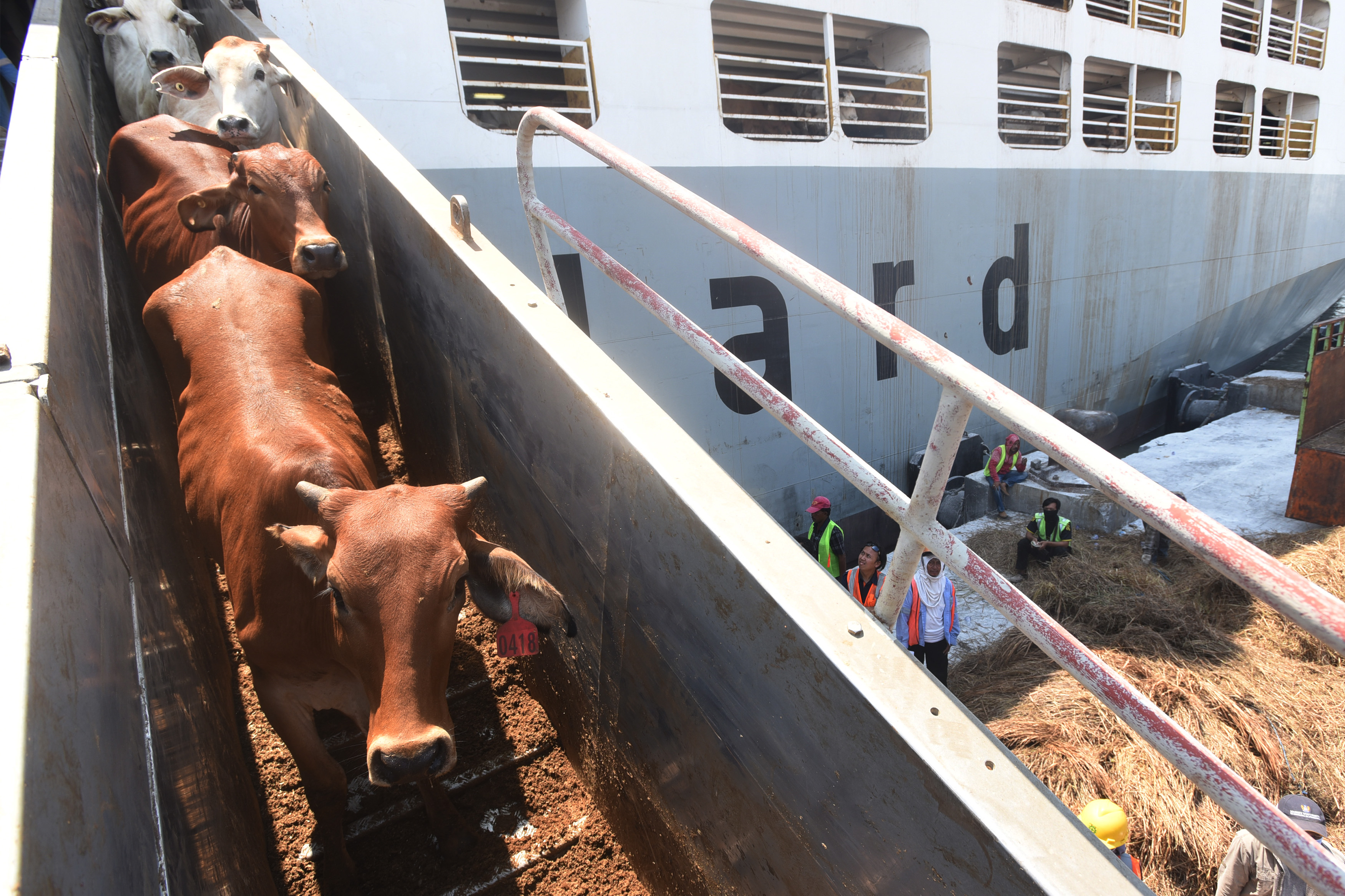 Sapi indukan asal Australia diturunkan dari kapal di Pelabuhan Perak, Surabaya, Jawa Timur, Kamis (28/4). Sebanyak 2000 sapi indukan asal Australia didatangkan ke Jawa Timur tersebut dengan tujuan mendukung peningkatan produksi sapi bakalan di provinsi itu. ANTARA FOTO/Zabur Karuru/aww/16.
