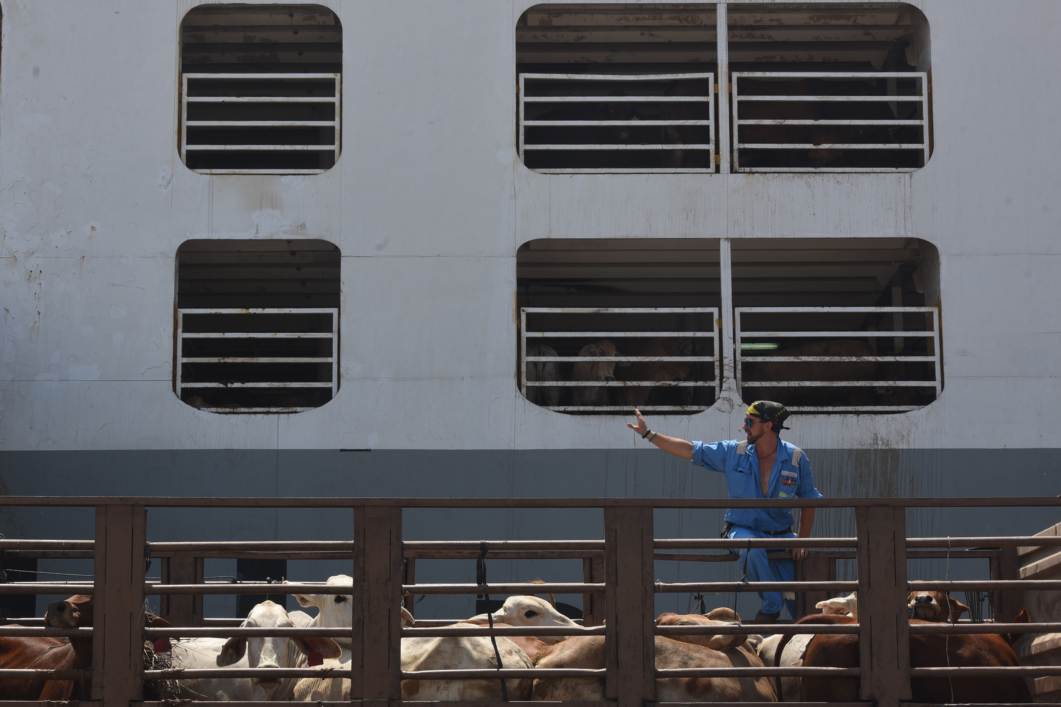 Pekerja mengawasi proses penurunan sapi indukan asal Australia dari kapal di Pelabuhan Perak, Surabaya, Jawa Timur, Kamis (28/4). Sebanyak 2.000 sapi indukan asal Australia didatangkan ke Jawa Timur tersebut dengan tujuan mendukung peningkatan produksi sapi bakalan di provinsi itu. ANTARA FOTO/Zabur Karuru/aww/16.
