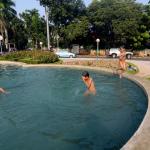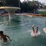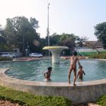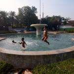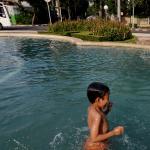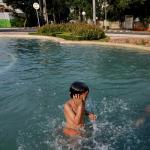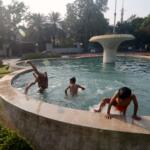 Sejumlah anak berenang di kolam air mancur, Jalan Teuku Umar, Menteng, Jakarta Pusat, Kamis (27/7/2017). Kurangnnya fasilitas umum lahan bermain, menyebabkan mereka memanfaatkan fasilitas air mancur taman kota untuk bermain. AKTUAL/Munzir