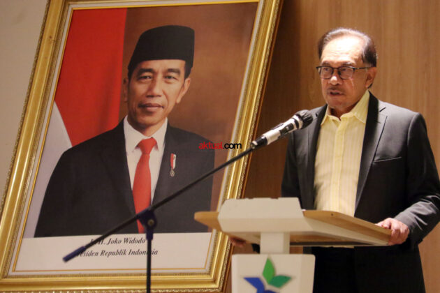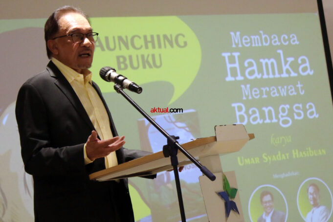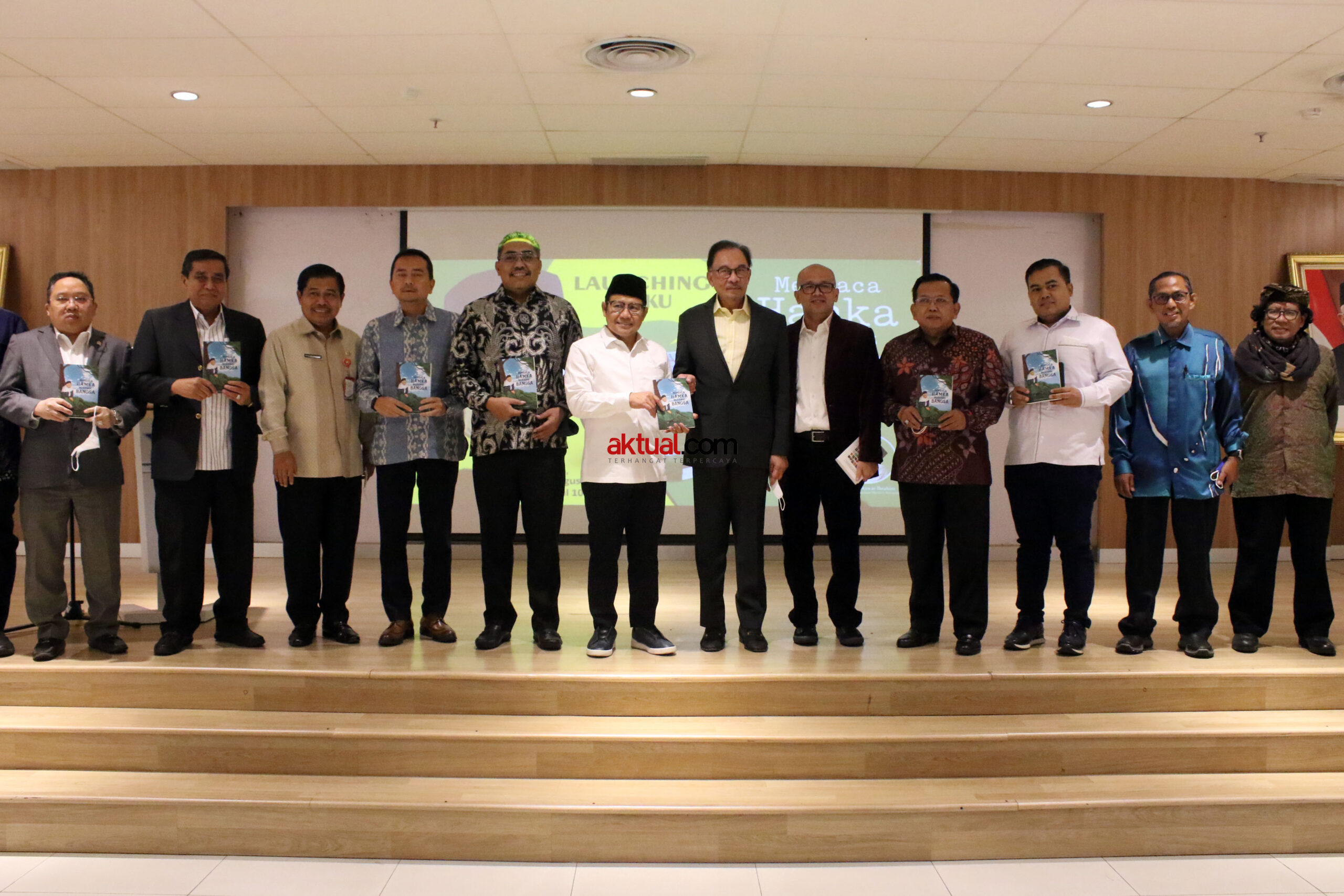 Wakil Perdana Menteri Malaysia pada era 1993 hingga 1998, Dato Seri Anwar Ibrahim, memberikan sambutan dalam peluncuran buku berjudul "Membaca Hamka Merawat Bangsa" karya Umar Syadat Hasibuan. Foto: Aktual / Ahmad Warnoto.