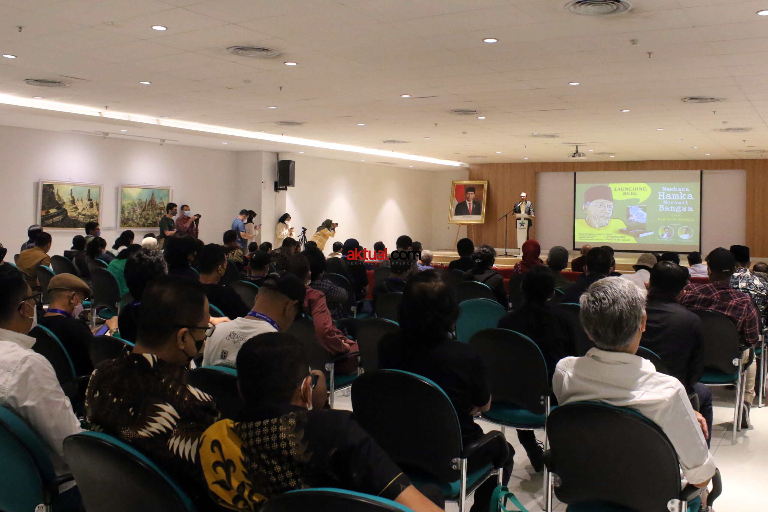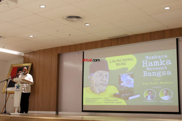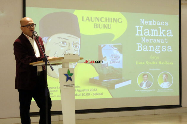 peluncuran buku berjUmar Syadat Hasibuan penulis buku "Membaca Hamka Merawat Bangsa" saat berikan sambutan juga bercerita tentang proses pembuatan buku tersebut. Foto: Aktual / Ahmad Warnoto.dul "Membaca Hamka Merawat Bangsa"