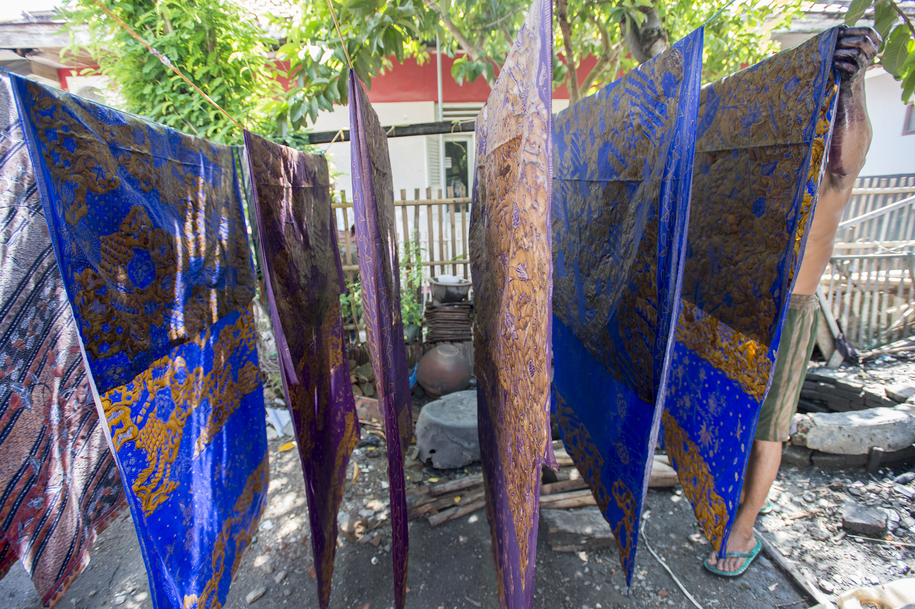 Seorang pengrajin batik menjemur kain batik usai diwarnai di salah satu rumah di Centra Batik Tulis Trusmi, Desa Trusmi Wetan, Plered, Cirebon, Jawa Barat, Sabtu (16/4). Batik tulis Trusmi merupakan batik tulis asli dari Cirebon yang sudah terkenal di dalam negeri maupun manca negara dengan berbagai motif diantaranya Paksinaga Liman, Megamendung, Patran Keris, Singa Payung, Singa Barong dan sebagainya. ANTARA FOTO/Widodo S. Jusuf/pd/16.