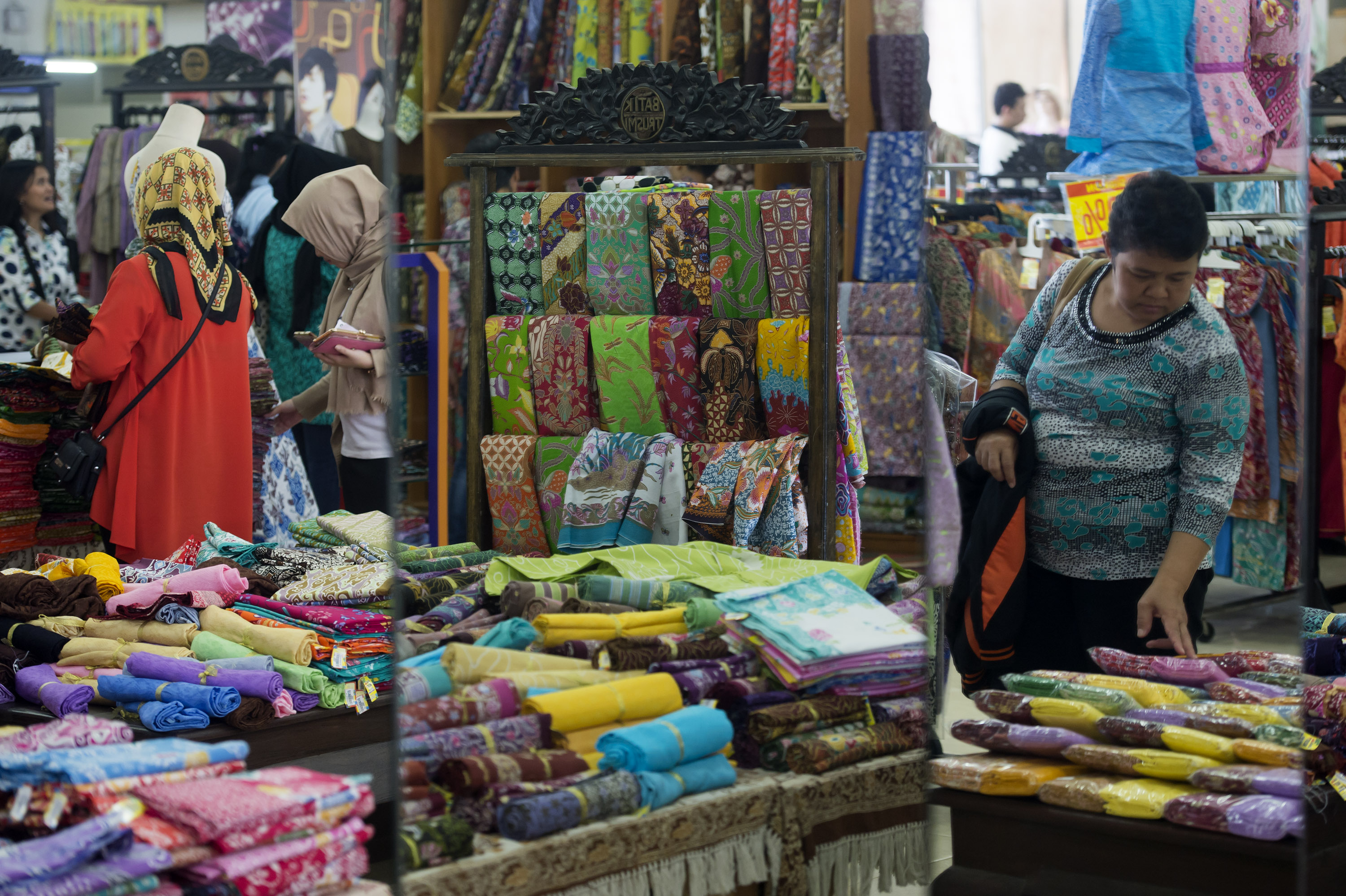 Sejumlah pengunjung memilih kain batik di salah satu toko di Centra Batik Tulis Trusmi, Desa Trusmi Wetan, Plered, Cirebon, Jawa Barat, Sabtu (16/4). Batik tulis Trusmi merupakan batik tulis asli dari Cirebon yang sudah terkenal di dalam negeri maupun manca negara dengan berbagai motif diantaranya Paksinaga Liman, Megamendung, Patran Keris, Singa Payung, Singa Barong dan sebagainya. ANTARA FOTO/Widodo S. Jusuf/pd/16.