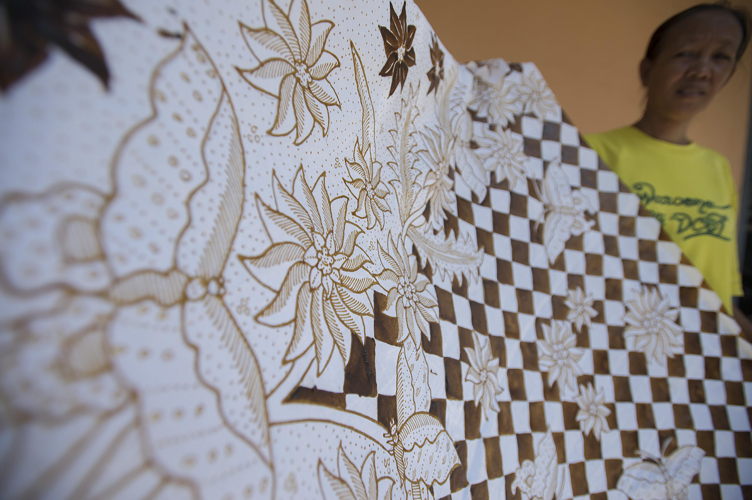 Seorang pengrajin batik menunjukkan kain yang telah ditorehkan lilin (malam) di salah satu rumah di Centra Batik Tulis Trusmi, Desa Trusmi Wetan, Plered, Cirebon, Jawa Barat, Sabtu (16/4). Batik tulis Trusmi merupakan batik tulis asli dari Cirebon yang sudah terkenal di dalam negeri maupun manca negara dengan berbagai motif diantaranya Paksinaga Liman, Megamendung, Patran Keris, Singa Payung, Singa Barong dan sebagainya. ANTARA FOTO/Widodo S. Jusuf/pd/16.