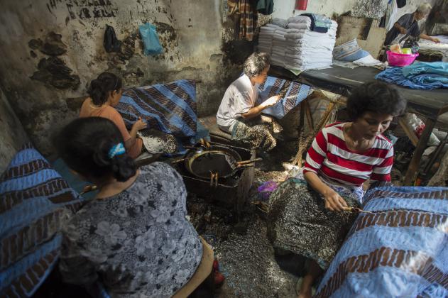 Sejumlah pengrajin batik mencanting lilin (malam) ke atas kain di salah satu rumah di Centra Batik Tulis Trusmi, Desa Trusmi Wetan, Plered, Cirebon, Jawa Barat, Sabtu (16/4). Batik tulis Trusmi merupakan batik tulis asli dari Cirebon yang sudah terkenal di dalam negeri maupun manca negara dengan berbagai motif diantaranya Paksinaga Liman, Megamendung, Patran Keris, Singa Payung, Singa Barong dan sebagainya. ANTARA FOTO/Widodo S. Jusuf/pd/16.