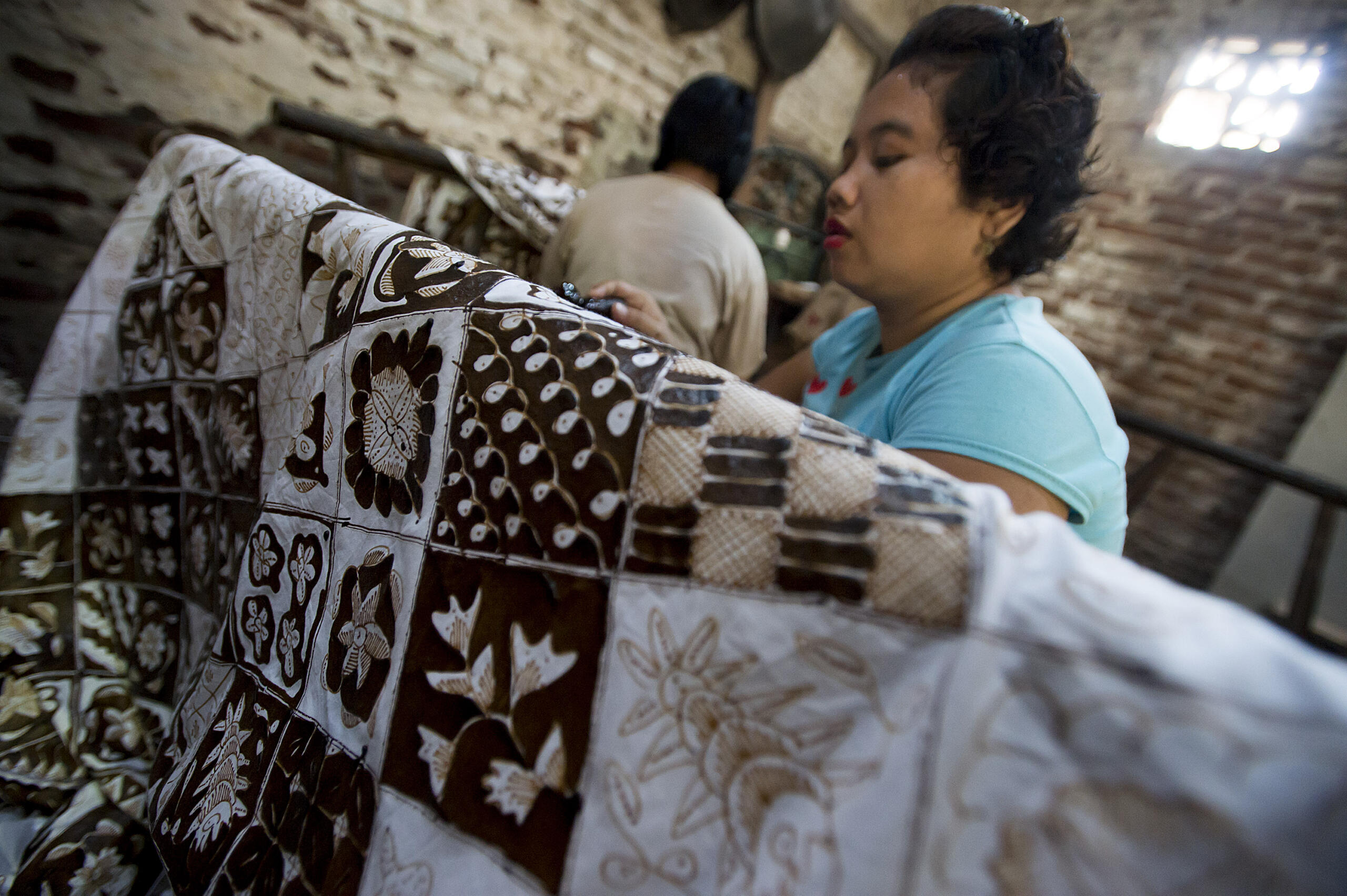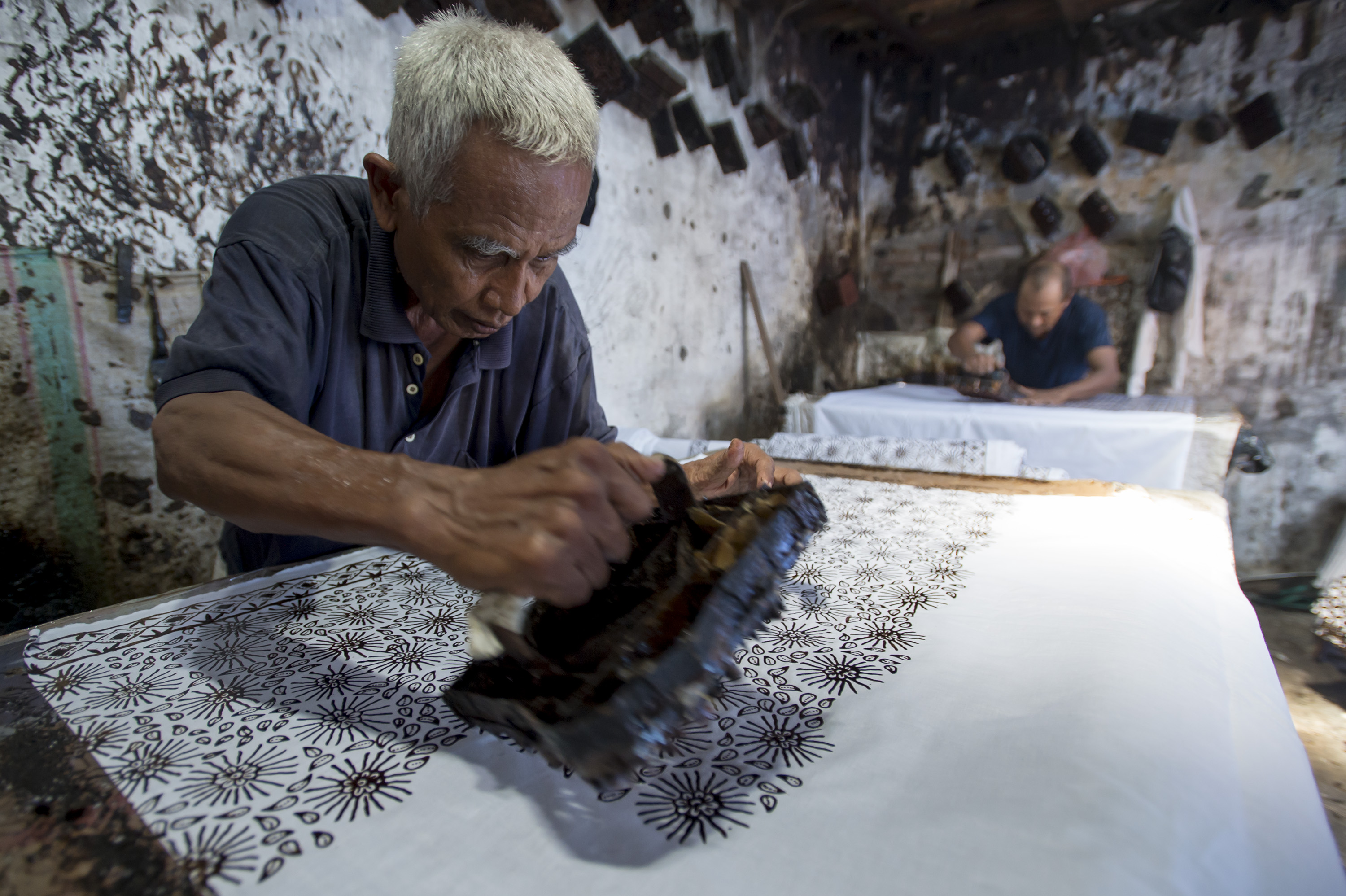 Dua orang pengrajin batik mengecap lilin (malam) ke atas kain di salah satu rumah di Centra Batik Tulis Trusmi, Desa Trusmi Wetan, Plered, Cirebon, Jawa Barat, Sabtu (16/4). Batik tulis Trusmi merupakan batik tulis asli dari Cirebon yang sudah terkenal di dalam negeri maupun manca negara dengan berbagai motif diantaranya Paksinaga Liman, Megamendung, Patran Keris, Singa Payung, Singa Barong dan sebagainya. ANTARA FOTO/Widodo S. Jusuf/pd/16.