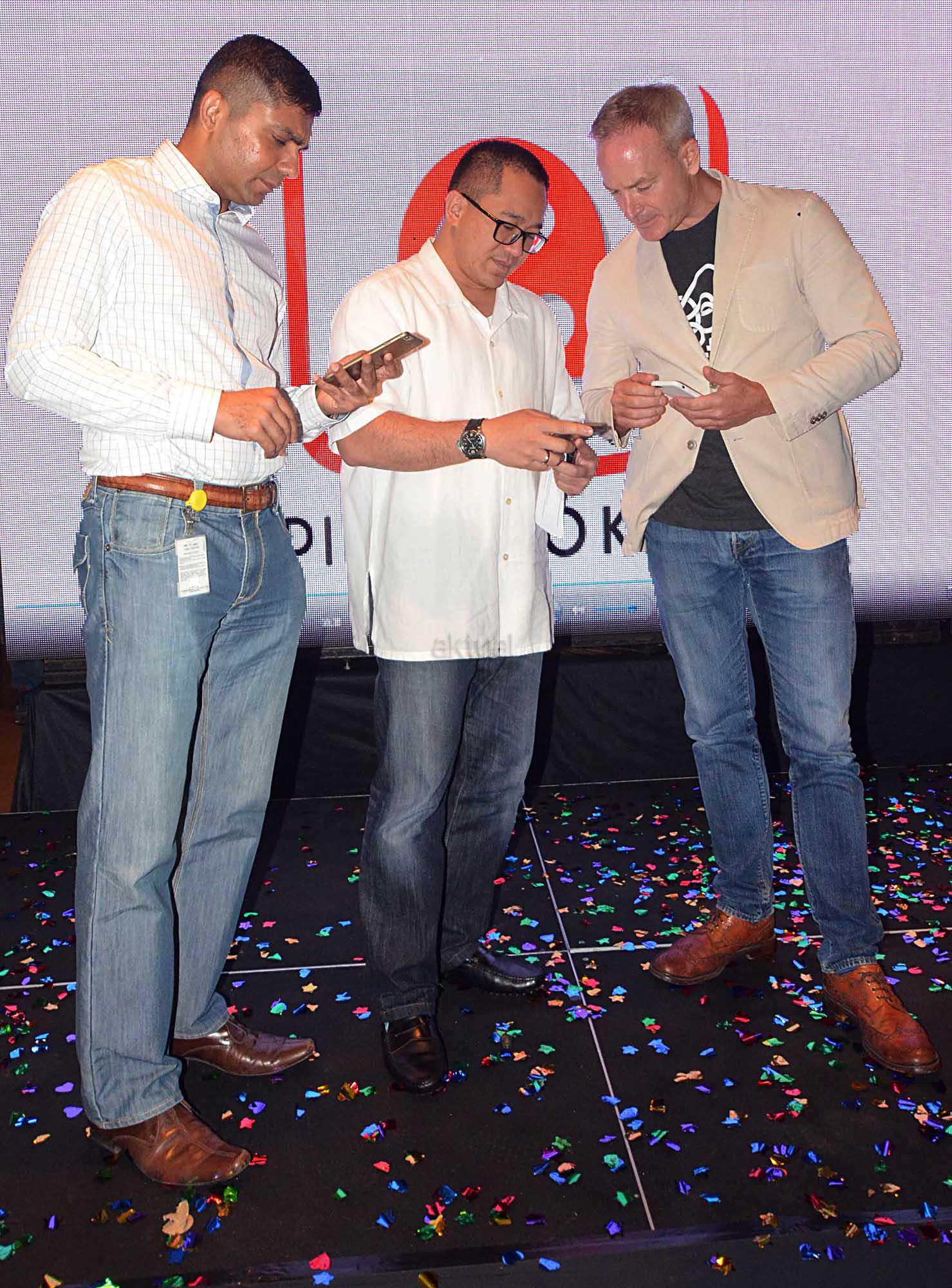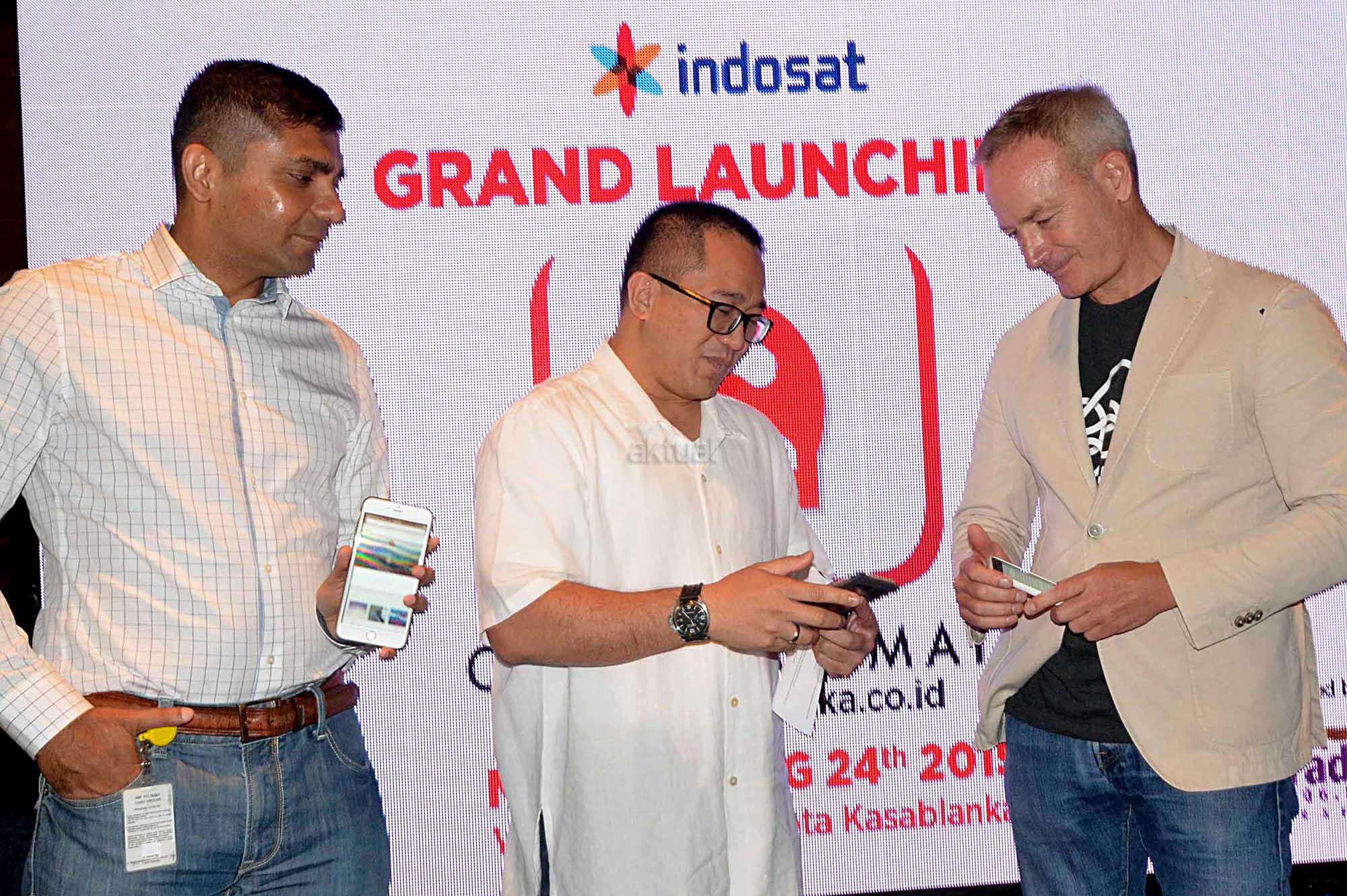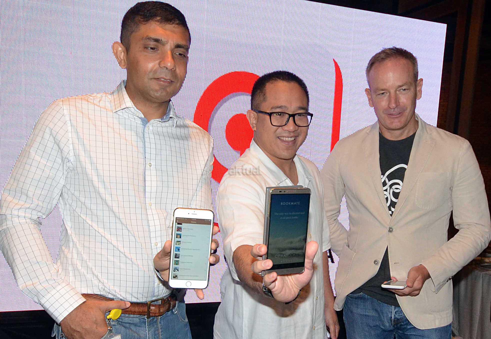 President Director Indosat, Alexander Rusli (tengah) bersama Chief Digital Services Officer Indosat, Prashant Gokarn (kiri) dan Founder Bookmate, Simon Dunlop (kanan) saat peluncuran Cipika Bookmate di Jakarta, Senin (24/8/2015). Indosat, anggota dari Grup Ooredoo menghadirkan inovasi layanan aplikasi buku digital dengan nama Cipika Bookmate yang memberikan kemudahan dan kenyamanan bagi para pencinta buku di Indonesia. Cipika Bookmate merupakan layanan aplikasi buku digital pertama di Indonesia yang menyajikan konsep berlangganan layaknya perpustakaan dengan membayar satu kali dan bisa membaca sepuasnya.Pelanggan bebas membaca buku apa saja yang tersedia di dalam Cipika Bookmate dengan total 500 ribu judul internasional dan 4 ribu judul lokal, melalui ponsel maupun desktop meskipun tanpa koneksi internet. AKTUAL/EKO S HILMAN