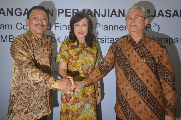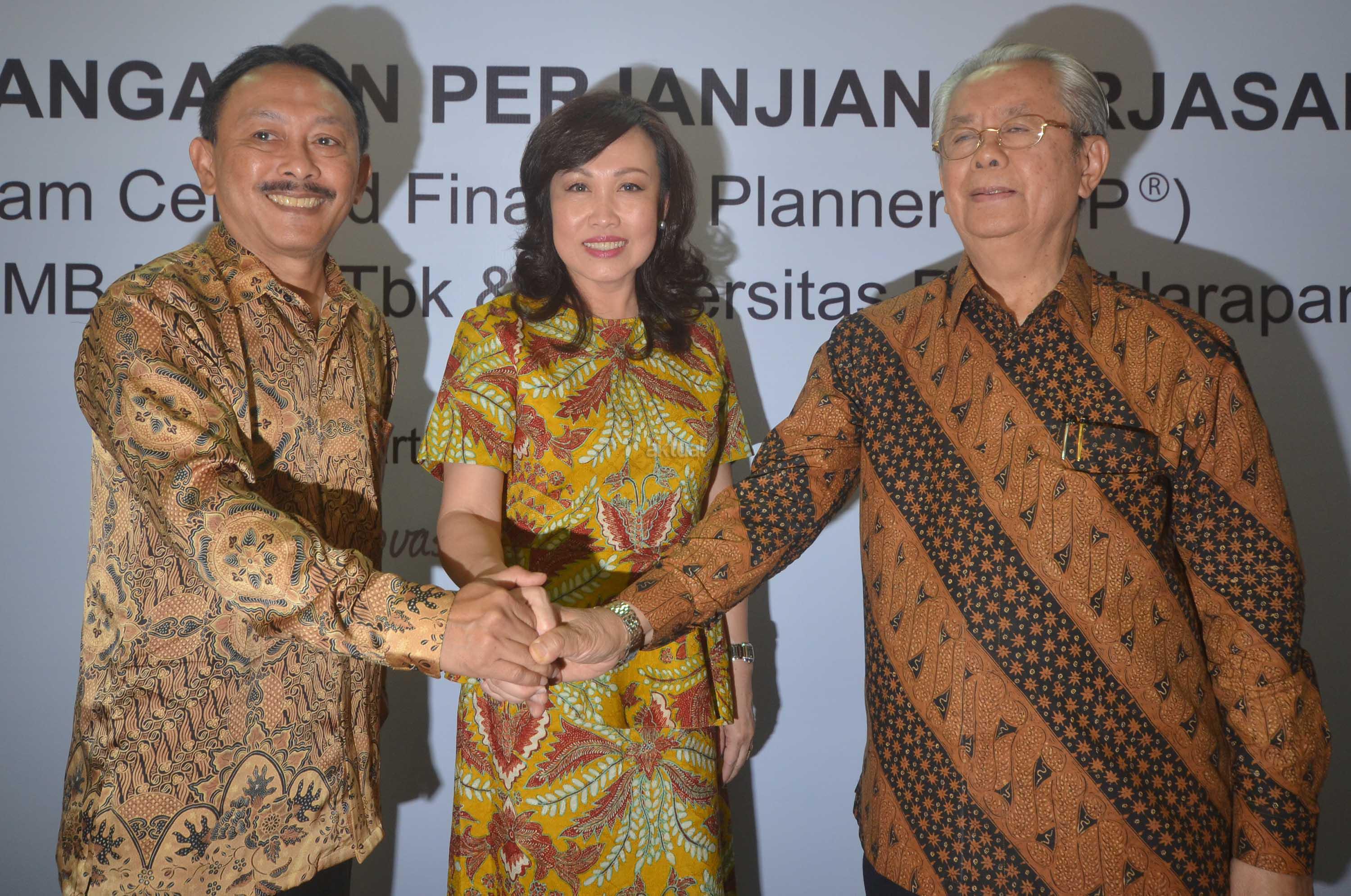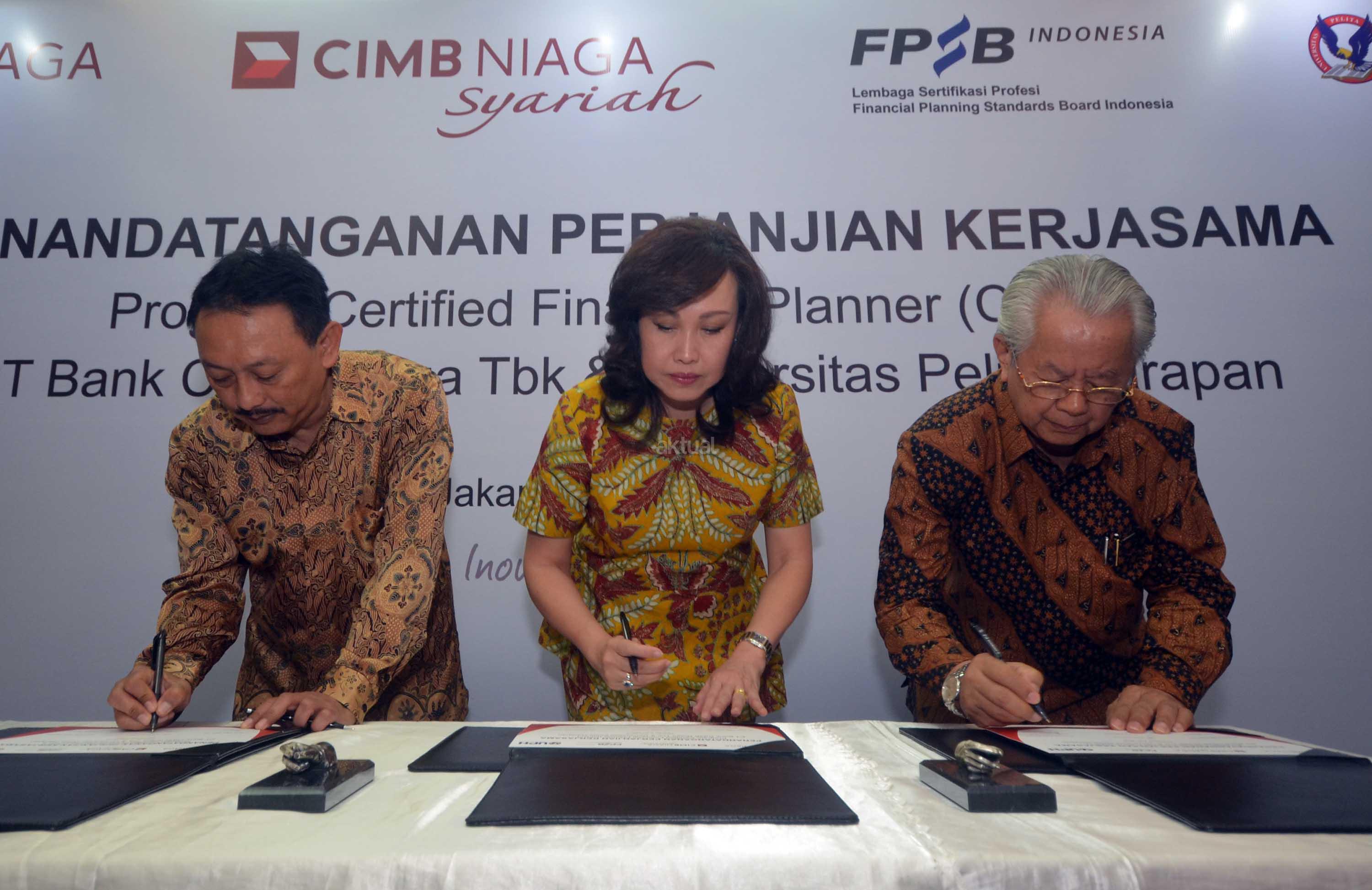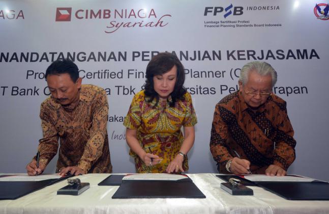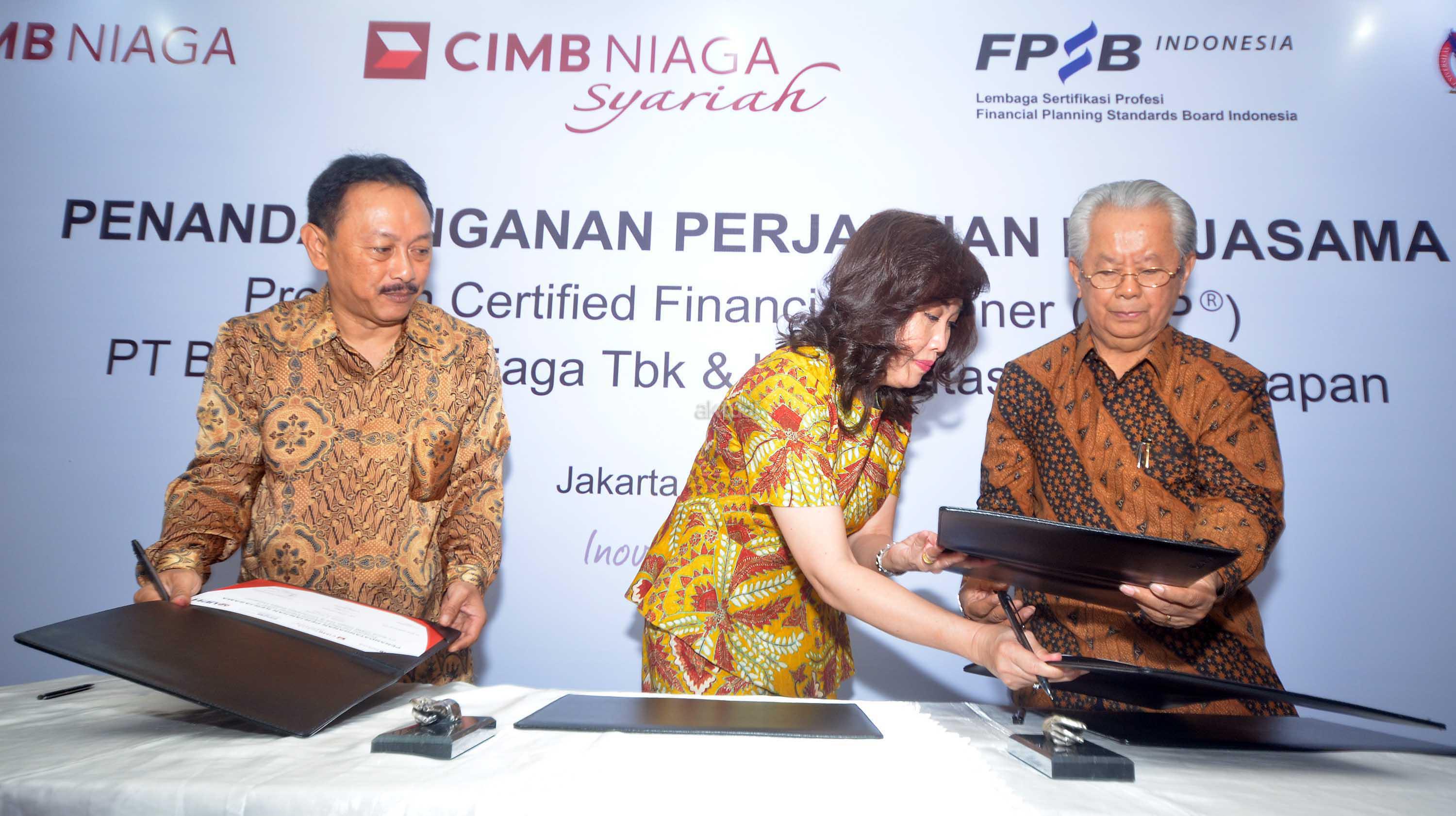 Direktur Consumer Banking PT Bank CIMB Niaga Tbk, Lani Darmawan (tengah) bersama dengan Rektor Universitas Pelita Harapan (UPH), Dr(Hon) Jonathan L Parapak,M Eng.Sc (kanan) dan Ketua Financial Planning Standards Board (FPSB) Indonesia, Tri Joko Santoso saat penandatangan naskah kerjasama penyelenggaraan pelatihan pendidikan sertifikasi international, Certified Financial Planner (CFP) di Jakarta, Kamis (2/6). Pelatihan ini bertujuan untuk melengkapi kompetensi para front liners CIMB Niaga dalam memberikan solusi pelayanan finansial secara lengkap sebagai financial advisor bagi para nasabah, terutama nasabah prima Preferred.Aktual.news/Eko S Hilman