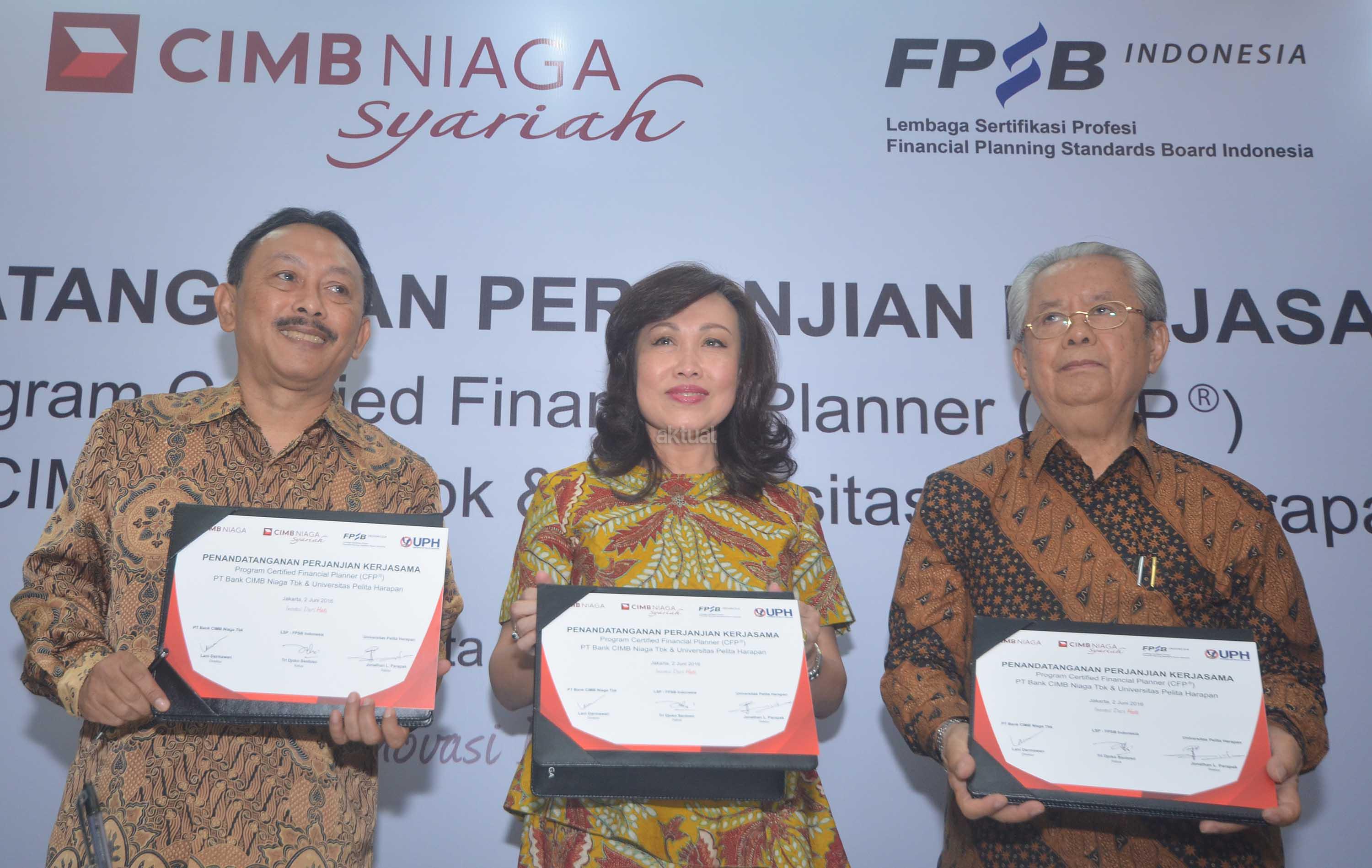 Direktur Consumer Banking PT Bank CIMB Niaga Tbk, Lani Darmawan (tengah) bersama dengan Rektor Universitas Pelita Harapan (UPH), Dr(Hon) Jonathan L Parapak,M Eng.Sc (kanan) dan Ketua Financial Planning Standards Board (FPSB) Indonesia, Tri Joko Santoso memperlihatkan naskah usai penandatangan kerjasama penyelenggaraan pelatihan pendidikan sertifikasi international, Certified Financial Planner (CFP) di Jakarta, Kamis (2/6). Pelatihan ini bertujuan untuk melengkapi kompetensi para front liners CIMB Niaga dalam memberikan solusi pelayanan finansial secara lengkap sebagai financial advisor bagi para nasabah, terutama nasabah prima Preferred.Aktual.news/Eko S Hilman