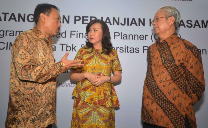 Direktur Consumer Banking PT Bank CIMB Niaga Tbk, Lani Darmawan (tengah) berbincang dengan Rektor Universitas Pelita Harapan (UPH), Dr(Hon) Jonathan L Parapak,M Eng.Sc (kanan) dan Ketua Financial Planning Standards Board (FPSB) Indonesia, Tri Joko Santoso (kiri) seusai penandatangan kerjasama penyelenggaraan pelatihan pendidikan sertifikasi international, Certified Financial Planner (CFP) di Jakarta, Kamis (2/6). Pelatihan ini bertujuan untuk melengkapi kompetensi para front liners CIMB Niaga dalam memberikan solusi pelayanan finansial secara lengkap sebagai financial advisor bagi para nasabah, terutama nasabah prima Preferred.Aktual.news/Eko S Hilman