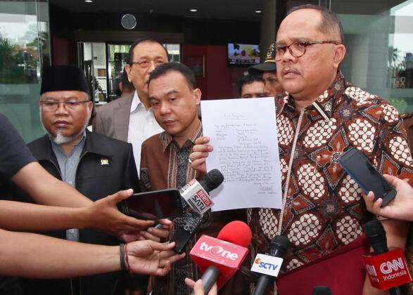 Ketua Mahkamah Kehormatan Dewan (MKD) Surahman Hidayat (kiri), Wakil Ketua Mahkamah Kehormatan Dewan (MKD) Kahar Muzakir (kedua kiri), Wakil Ketua Mahkamah Kehormatan Dewan (MKD) Sufmi Dasco Ahmad (ketiga kiri), dan Wakil Ketua Mahkamah Kehormatan Dewan Junimart Girsang (kanan) memberikan keterangan kepada wartawan usai mendatangi Kejaksaan Agung, Jakarta, Kamis (10/12). Kedatangan MKD tersebut untuk meminjam bukti rekaman orisinal percakapan antara Ketua DPR Setya Novanto, pengusaha Riza Chalid dan Presiden Direktur PT Freeport Indonesia, Maroef Sjamsoeddin terkait kasus perpanjangan kontrak Freeport. ANTARA FOTO/Rivan Awal Lingga/foc/15.