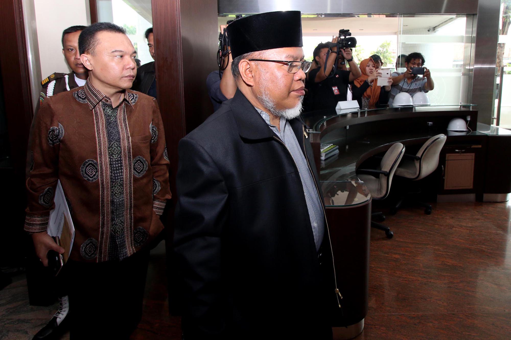 Ketua Mahkamah Kehormatan Dewan (MKD) Surahman Hidayat (kanan) bersama Wakil Ketua Mahkamah Kehormatan Dewan (MKD) Sufmi Dasco Ahmad (kiri) mendatangi Kejaksaan Agung, Jakarta, Kamis (10/12). Kedatangan MKD tersebut untuk meminjam bukti rekaman orisinal percakapan antara Ketua DPR Setya Novanto, pengusaha Riza Chalid dan Presiden Direktur PT Freeport Indonesia, Maroef Sjamsoeddin terkait kasus perpanjangan kontrak Freeport. ANTARA FOTO/Rivan Awal Lingga/foc/15.