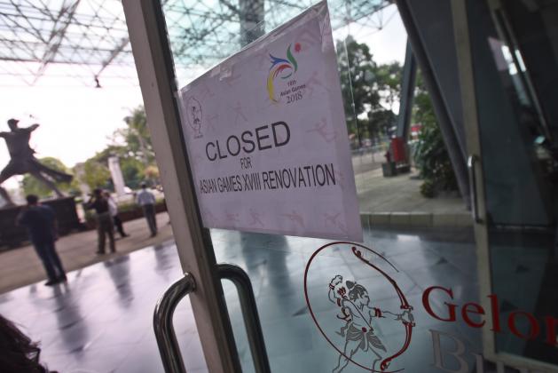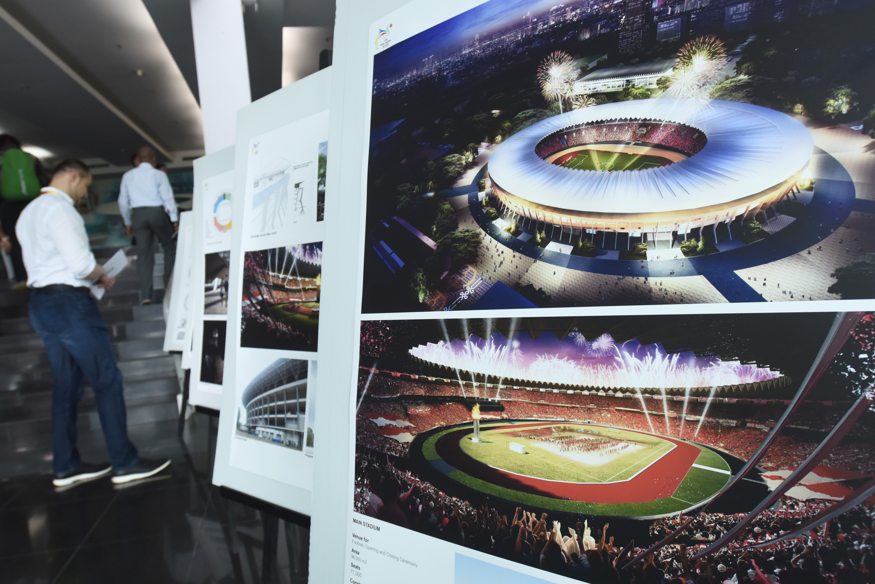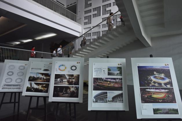 Delegasi Dewan Olimpiade Asia (OCA) melintasi desain renovasi Venue Stadion Utama Gelora Bung Karno untuk kejuaraan Asian Games 2018 di Jakarta, Selasa (10/5). Renovasi GBK yang akan digunakan sebagai lokasi pembukaan dan penutupan Asian Games 2018 itu akan dimulai pada Juni mendatang. ANTARA FOTO/Wahyu Putro A/foc/16.