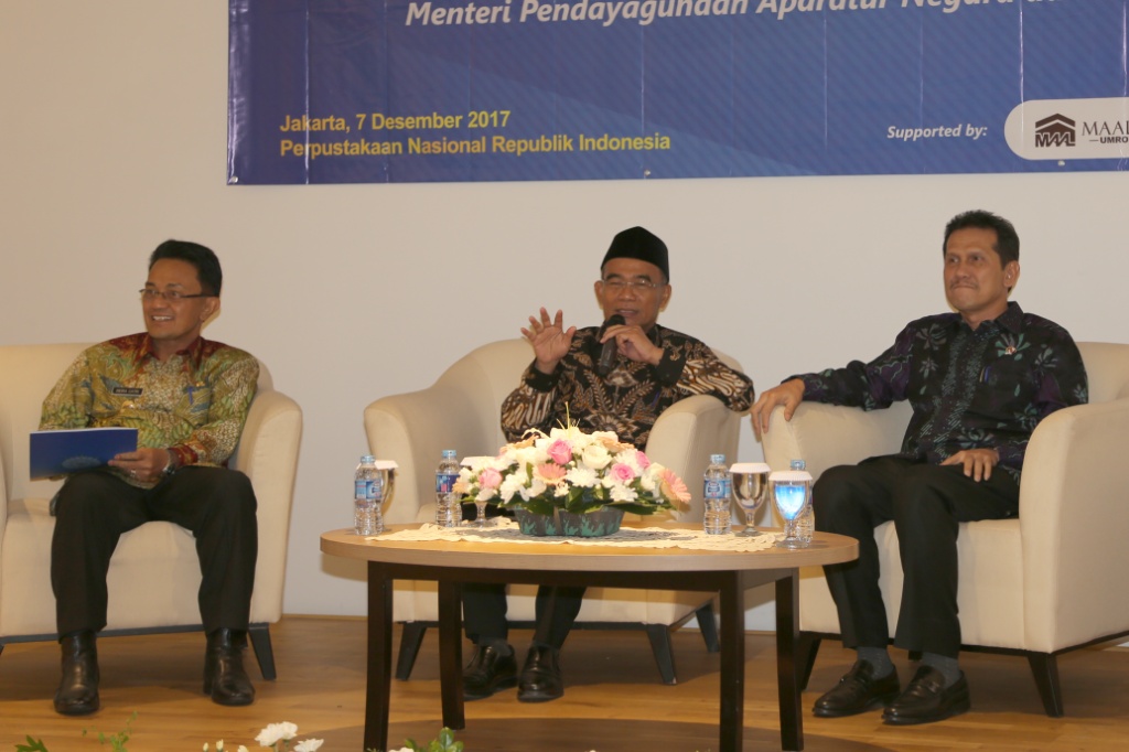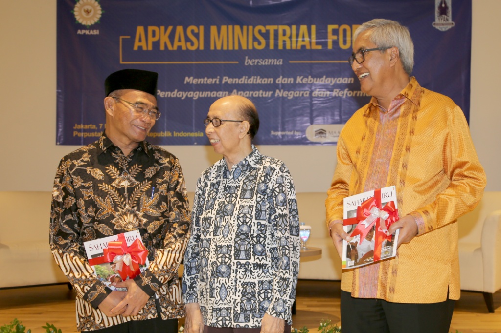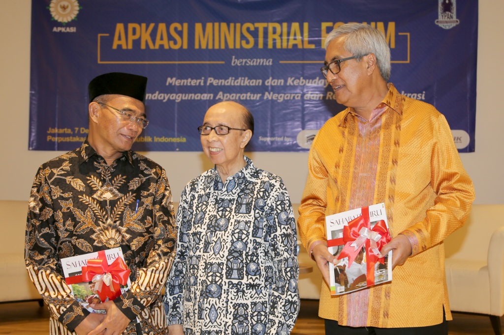 Dari kiri Mendikbud Muhajir Effendi, Ketua Dewan Pembina Yayasan AdiluhungYahya Muhaimin dan Wakil Ketua Umum Apkasi (Bupati Sumba Tengah) Umbu Sappi Pateduk berbincang usai meluncurkan majalah Sahabat Guru di Jakarta, Kamis (7/12). Asosiasi Pemerintah Kabupaten Seluruh Indonesia (Apkasi) mengajak Bupati dan pejabat Kabupaten berdialog dengan Mendikbud dan Menpan-RB dalam acra Ministrial Forum dengan tema menyikapi situasi Gawat Darurat Guru. AKTUAL/Eko S Hilman