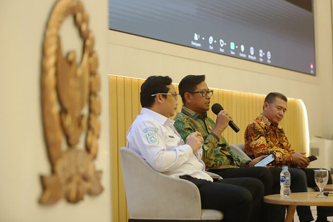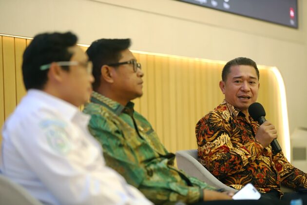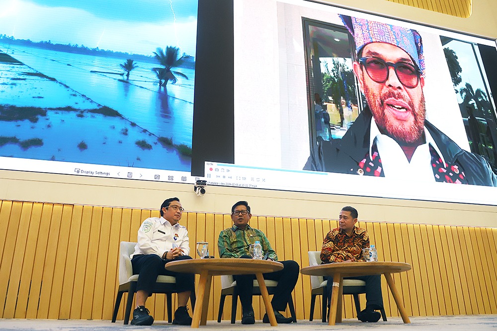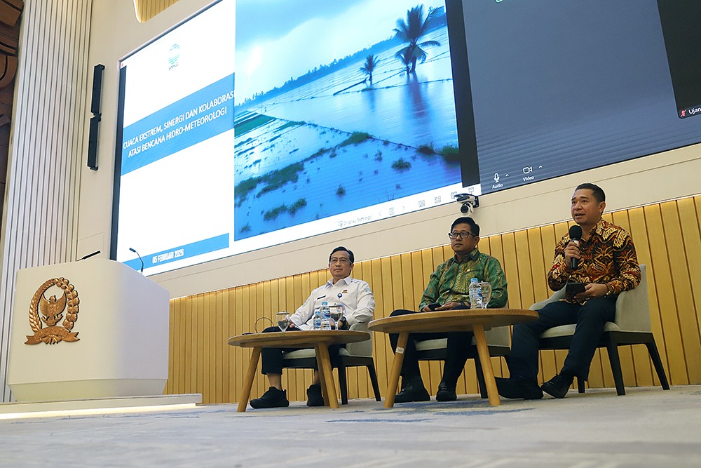 Anggota Komisi V DPR Fraksi Partai Kebangkitan Bangsa Sujatmiko (tengah) dan Pelaksana Tugas Deputi Bidang Meteorologi Badan Meteorologi, Klimatologi, dan Geofisika (BMKG) Andri Ramdhani (kiri) menjadi pembicara dalam diskusi saat diskusi Dialektika Demokrasi bertema “Cuaca Ekstrem, Sinergi dan Kolaborasi Bersama Atasi Bencana” di gedung nusantara, Kompleks Parlemen, Senayan, Jakarta, Kamis (5/2/2026).