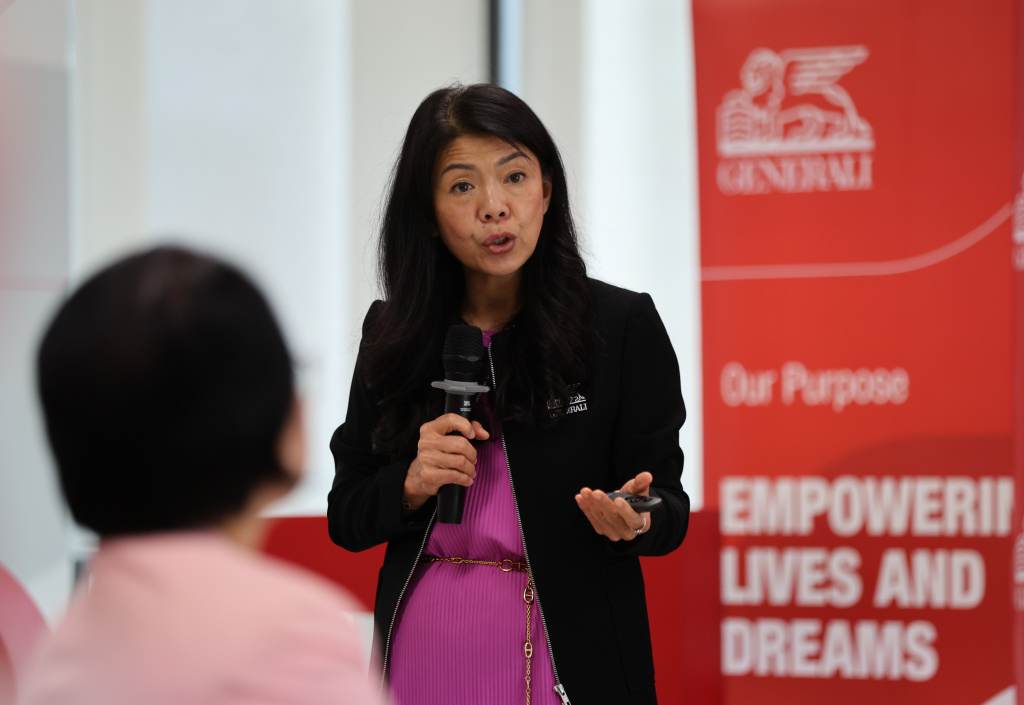 President Director & CEO Generali Indonesia, Rebecca Tan menyampaikan sambutan acara talkshow dengan tema ‘Women Leading with Impact’ yang diselenggarakan di Kantor Pusat Generali Indonesia, Jakarta, Rabu (1/4/2026).
