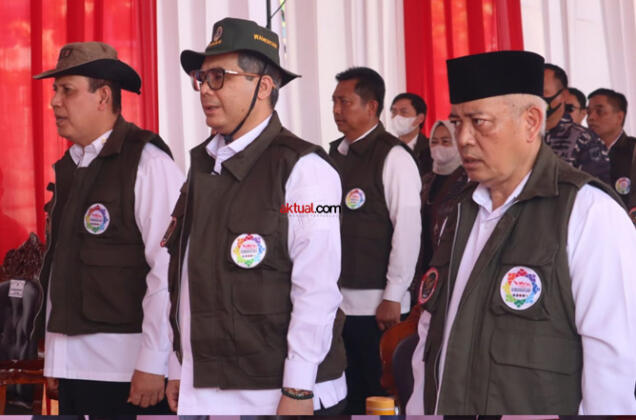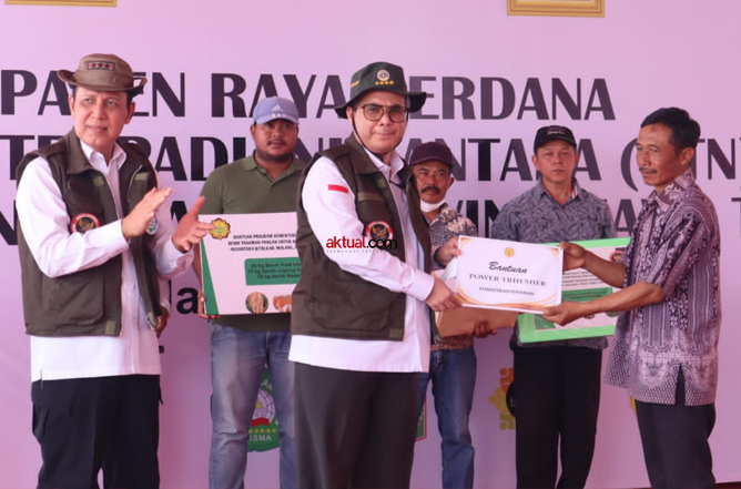 Wakil Menteri Pertanian (Wamentan), Harvick Hasnul Qolbi (tengah) didampingi Kepala BNPT, Komjen Pol Boy Rafli Amar (kiri) saat menyerahkan bantuan Alat Mesin Pertanian (Alsintan) secara simbolis di KTN Turen, Kabupaten Malang, Kamis (14/7). Foto Ist