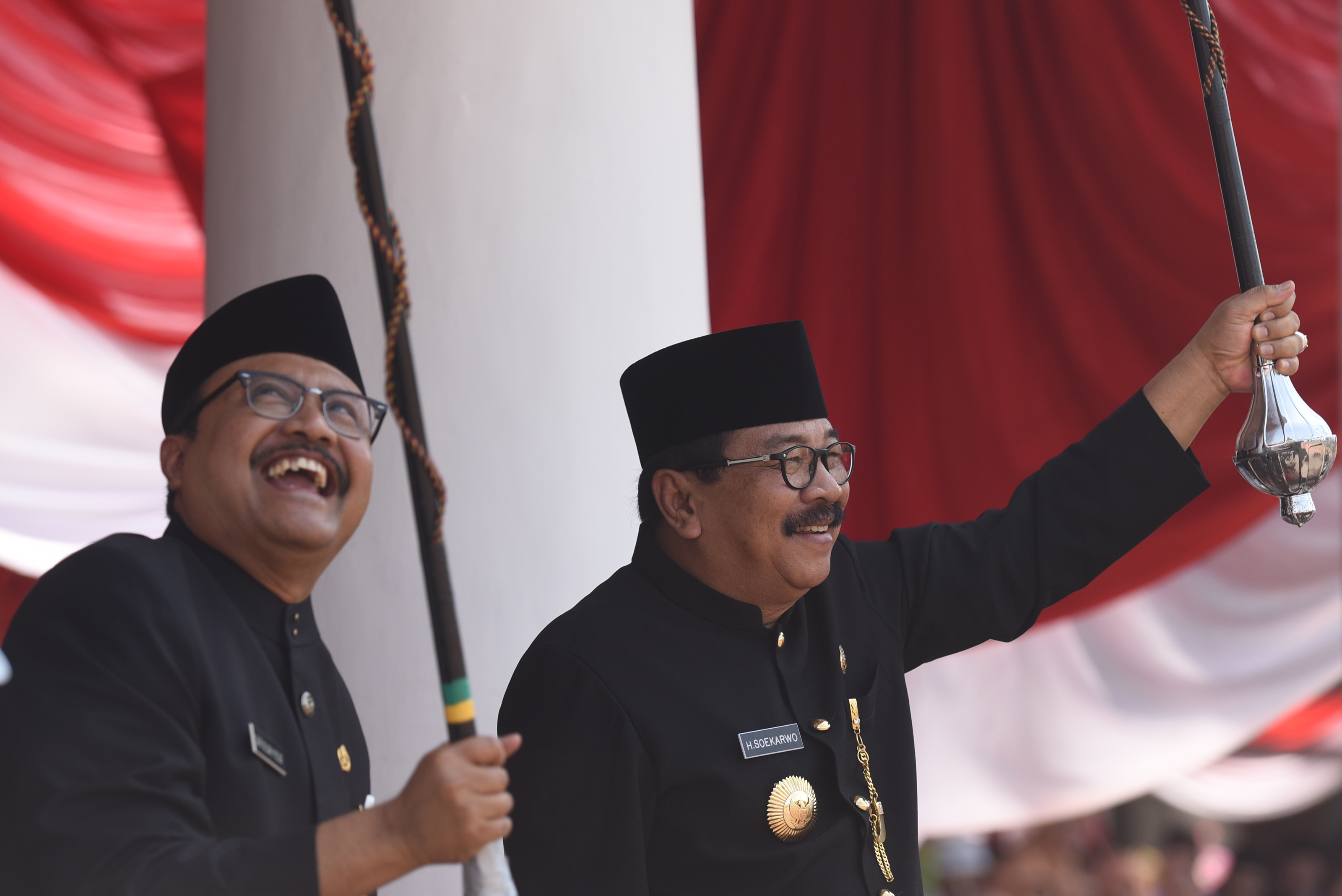 Gubernur Jawa Timur Soekarwo (kanan) dan Wakil Gubernur Jawa TImur Saifullah Yusuf (kiri) memainkan tongkat mayoret drum band pada Upacara Peringatan HUT ke-70 Jawa Timur di Grahadi, Surabaya, Jawa Timur, Senin (12/10). Peringatan tersebut mengangkat tema "Ayo Kerja, Perkuat Jatim sebagai Provinsi Industri Berbasis UMKM". ANTARA FOTO/Zabur Karuru/aww/15.