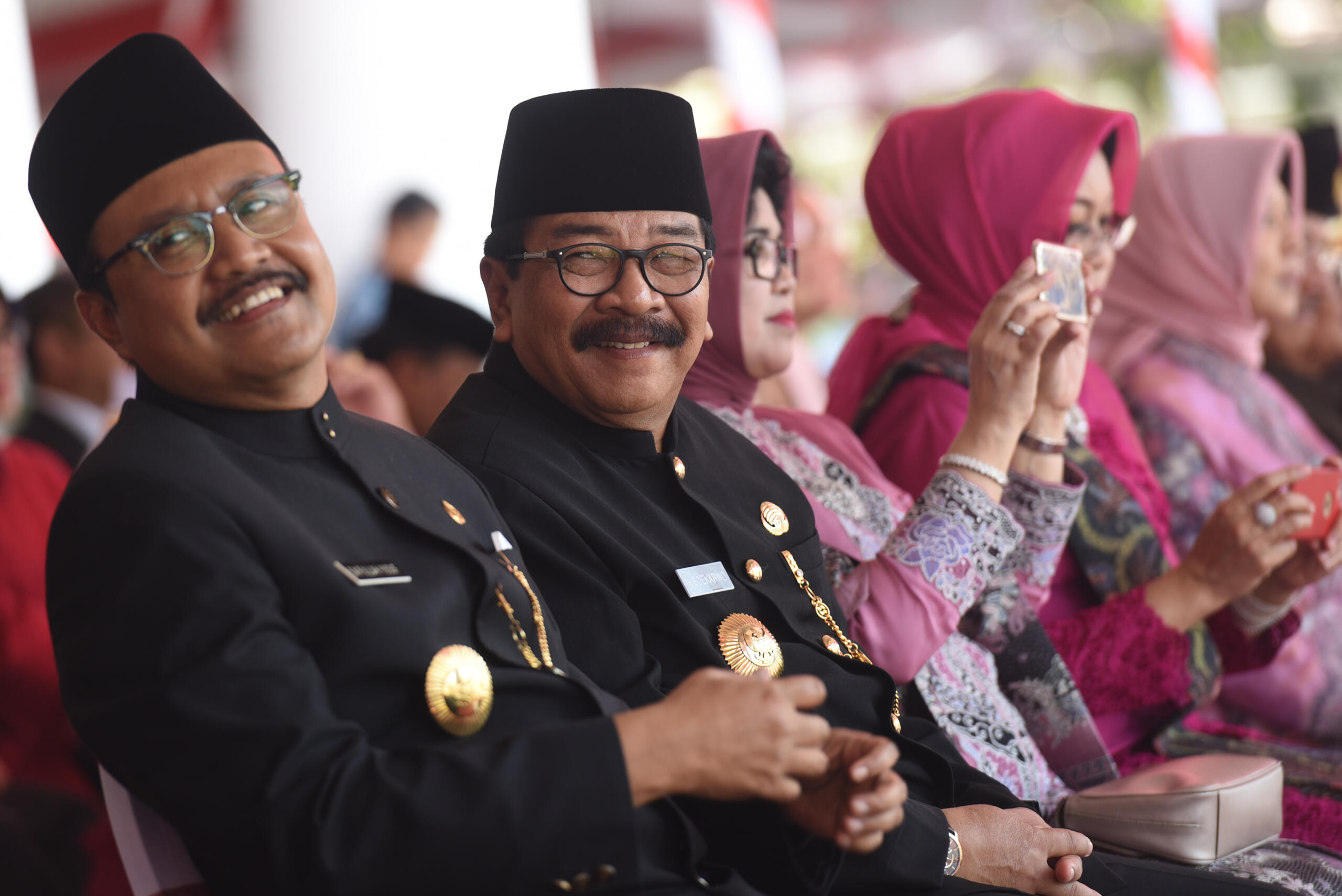 Gubernur Jawa Timur Soekarwo (kedua kiri) berbincang dengan Wakil Gubernur Jawa Timur Saifullah Yusuf (kiri) saat Upacara Peringatan HUT ke-70 Jawa Timur di Grahadi, Surabaya, Jawa Timur, Senin (12/10). Peringatan tersebut mengangkat tema "Ayo Kerja, Perkuat Jatim sebagai Provinsi Industri Berbasis UMKM". ANTARA FOTO/Zabur Karuru/aww/15.