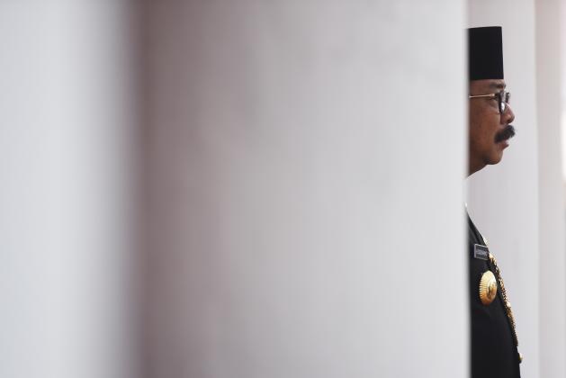 Gubernur Jawa Timur Soekarwo memimpin Upacara Peringatan HUT ke-70 Jawa Timur di Grahadi, Surabaya, Jawa Timur, Senin (12/10). Peringatan tersebut mengangkat tema "Ayo Kerja, Perkuat Jatim sebagai Provinsi Industri Berbasis UMKM". ANTARA FOTO/Zabur Karuru/aww/15.
