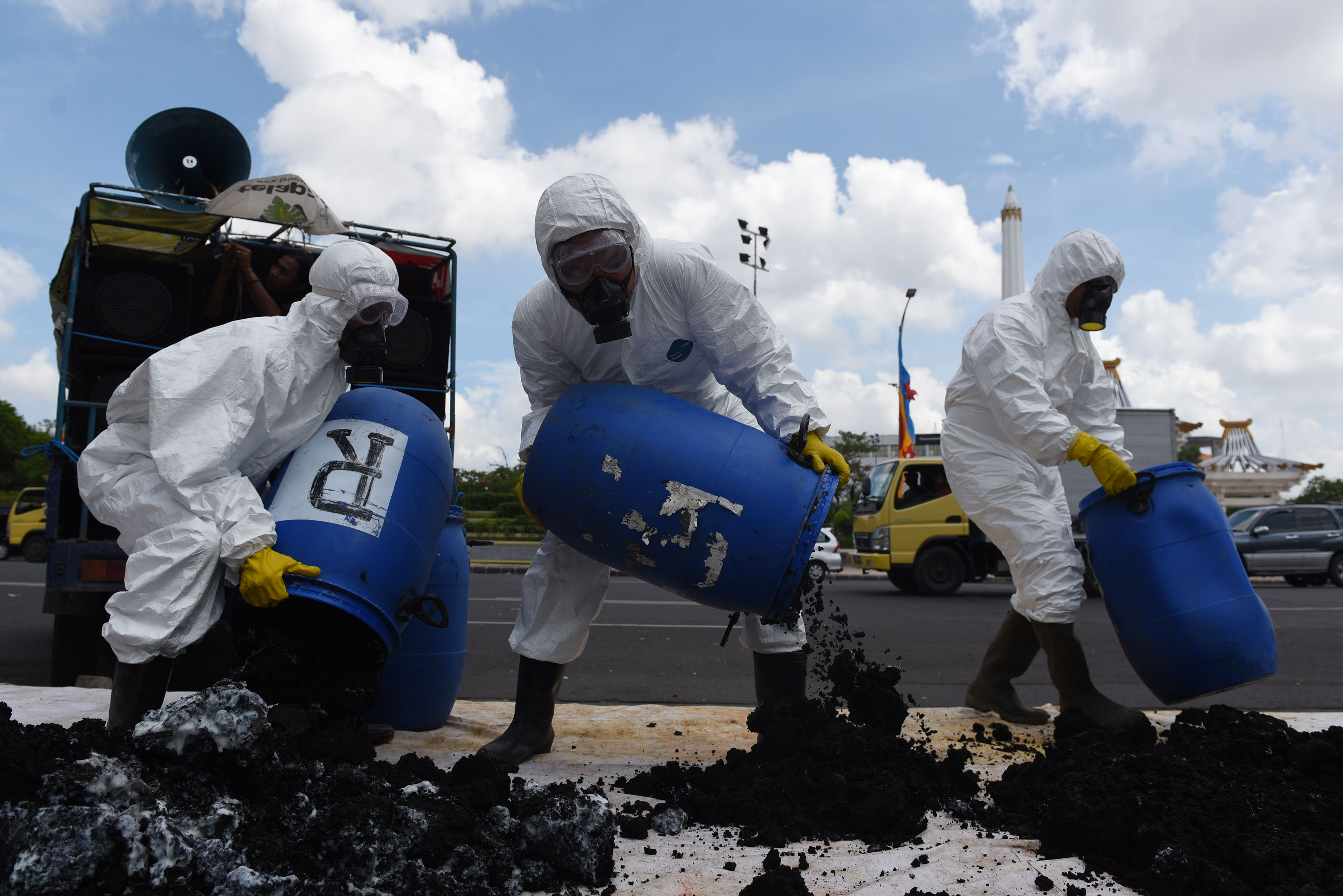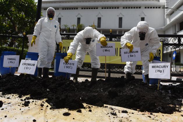 Aktivis yang tergabung dalam Lembaga Kajian Ekologi dan Konservasi Lahan Basah (Ecoton) menuangkan limbah bahan berbahaya dan beracun (B3) saat Kampanye Clean Up Timbunan B3 di Jawa Timur di depan Kantor Gubernur, Surabaya, Jawa Timur, Kamis (12/5). Dalam aksinya mereka mendesak agar pemerintah mereformasi kebijakan tata kelola B3 di Jawa Timur terkait Perijinan transporter B3, Pemanfaatan B3, Pengelolaan B3 dan sanitary Lanfill B3 serta memberikan sanksi kepada pihak-pihak yang terlibat dalam pembiaran dan pelaku pelanggaran tata kelola B3. ANTARA FOTO/Zabur Karuru/foc/16.