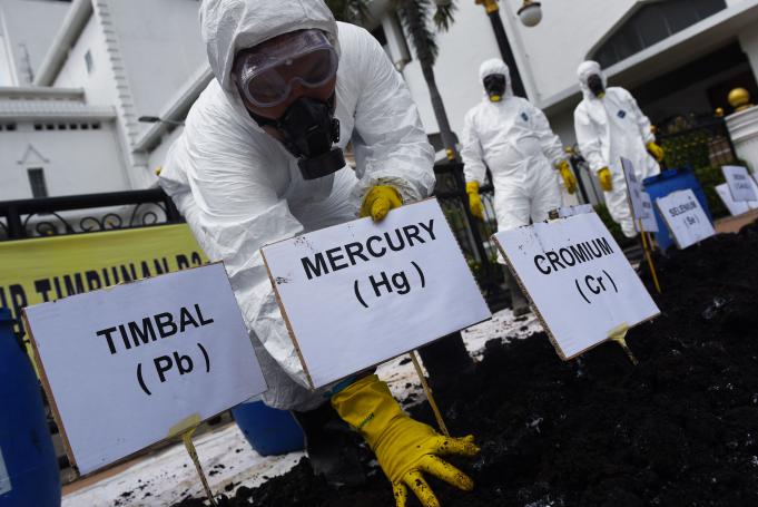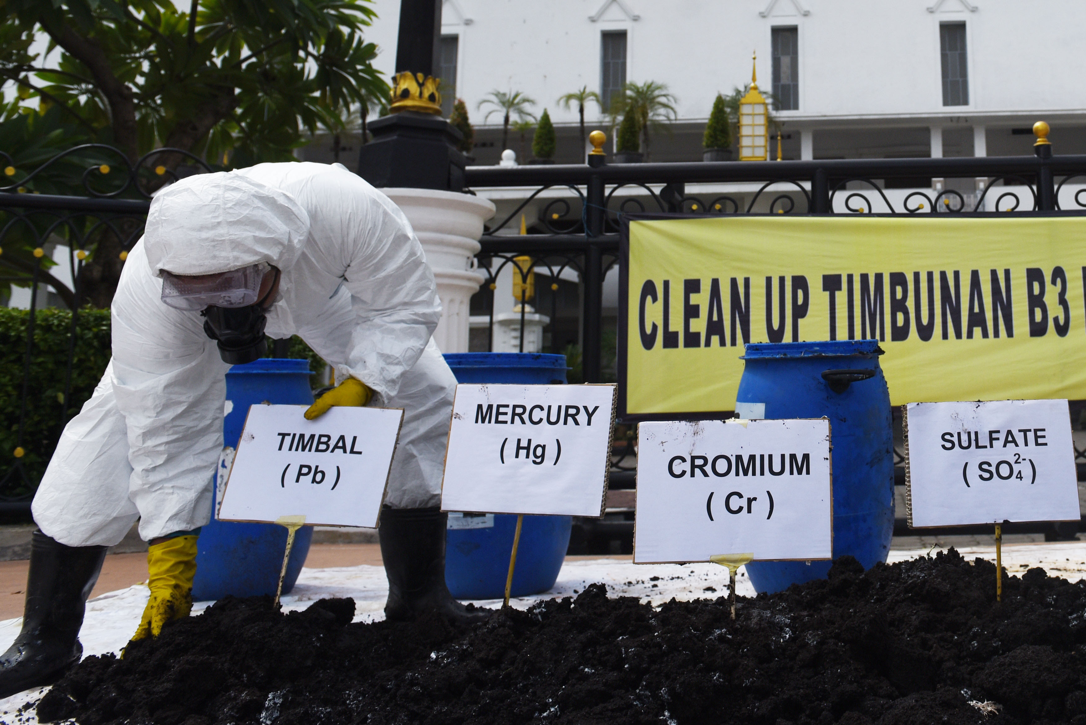 Aktivis yang tergabung dalam Lembaga Kajian Ekologi dan Konservasi Lahan Basah (Ecoton) memberikan tanda zat beracun yang terdapat pada limbah bahan berbahaya dan beracun (B3) saat Kampanye Clean Up Timbunan B3 di Jawa Timur di depan Kantor Gubernur, Surabaya, Jawa Timur, Kamis (12/5). Dalam aksinya mereka mendesak agar pemerintah mereformasi kebijakan tata kelola B3 di Jawa Timur terkait Perijinan transporter B3, Pemanfaatan B3, Pengelolaan B3 dan sanitary Lanfill B3 serta memberikan sanksi kepada pihak-pihak yang terlibat dalam pembiaran dan pelaku pelanggaran tata kelola B3. ANTARA FOTO/Zabur Karuru/foc/16.