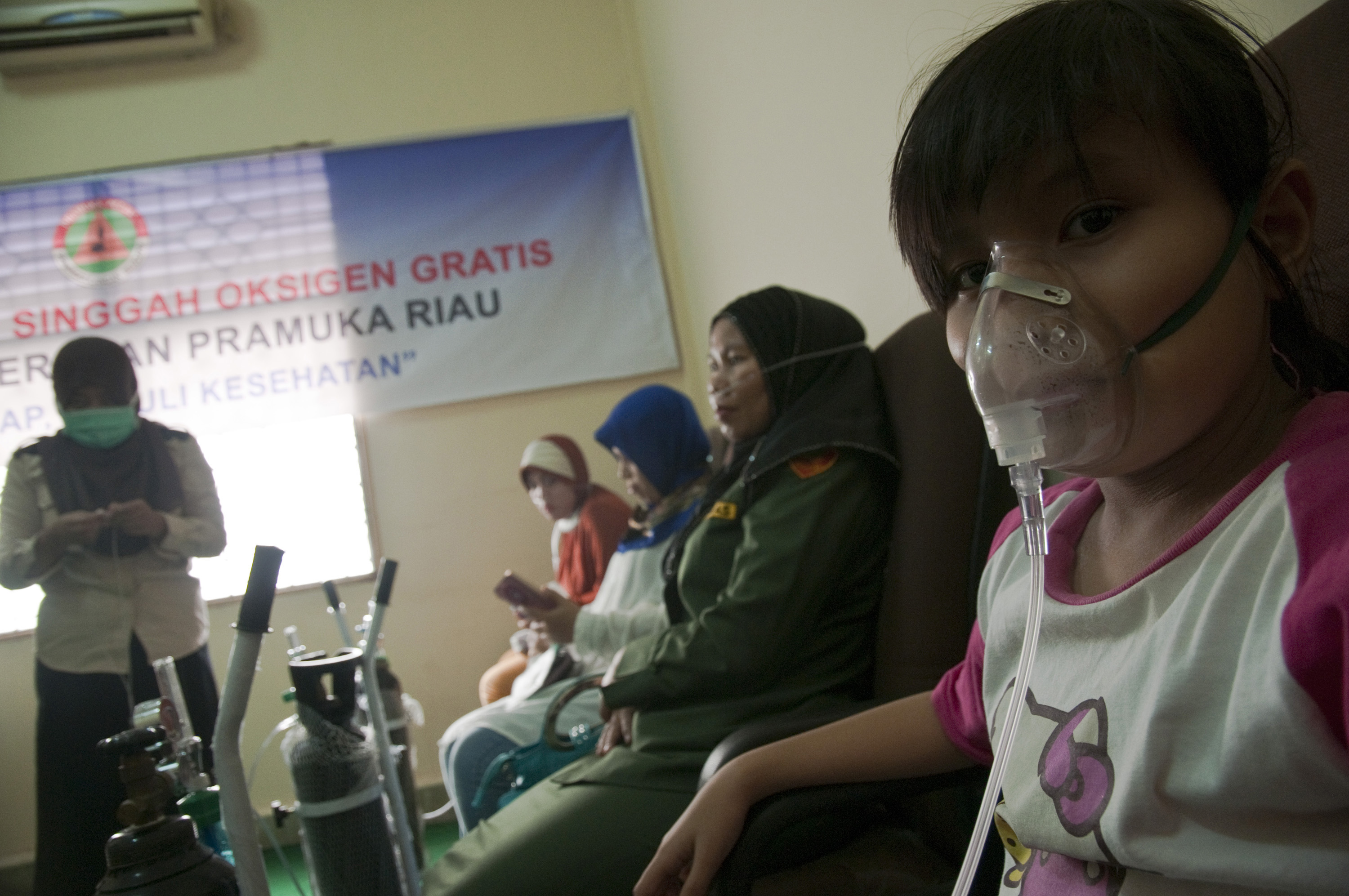 Seorang anak berusia 10 tahun bernama Nanda menghirup oksigen dari tabung yang disediakan secara gratis di “Rumah Singgah Oksigen” di Kantor Pramuka Riau, di Kota Pekanbaru, Senin (26/10). Badan Nasional Penanggulangan Bencana (BNPB) menyatakan jumlah korban akibat dampak kabut asap kebakaran lahan dan hutan terus bertambah ditandai dengan 10 orang tewas di Sumatera dan Kalimantan, baik dampak langsung dan tidak langsung, serta menyebabkan 503.874 orang menderita Infeks Salura Pernafasan Akut (ISPA) di enam provinsi sejak 1 Juli-23 Oktober 2015. ANTARA FOTO/FB Anggoro/foc/15.Sejumlah warga menghirup oksigen dari tabung yang disediakan secara gratis di “Rumah Singgah Oksigen” di Kantor Pramuka Riau, di Kota Pekanbaru, Senin (26/10). Badan Nasional Penanggulangan Bencana (BNPB) menyatakan jumlah korban akibat dampak kabut asap kebakaran lahan dan hutan terus bertambah ditandai dengan 10 orang tewas di Sumatera dan Kalimantan, baik dampak langsung dan tidak langsung, serta menyebabkan 503.874 orang menderita Infeks Salura Pernafasan Akut (ISPA) di enam provinsi sejak 1 Juli-23 Oktober 2015. ANTARA FOTO/FB Anggoro/foc/15.