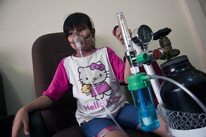 Seorang anak berusia 10 tahun bernama Nanda menghirup oksigen dari tabung yang disediakan secara gratis di "Rumah Singgah Oksigen" di Kantor Pramuka Riau, di Kota Pekanbaru, Senin (26/10). Badan Nasional Penanggulangan Bencana (BNPB) menyatakan jumlah korban akibat dampak kabut asap kebakaran lahan dan hutan terus bertambah ditandai dengan 10 orang tewas di Sumatera dan Kalimantan, baik dampak langsung dan tidak langsung, serta menyebabkan 503.874 orang menderita Infeks Salura Pernafasan Akut (ISPA) di enam provinsi sejak 1 Juli-23 Oktober 2015. ANTARA FOTO/FB Anggoro/foc/15.