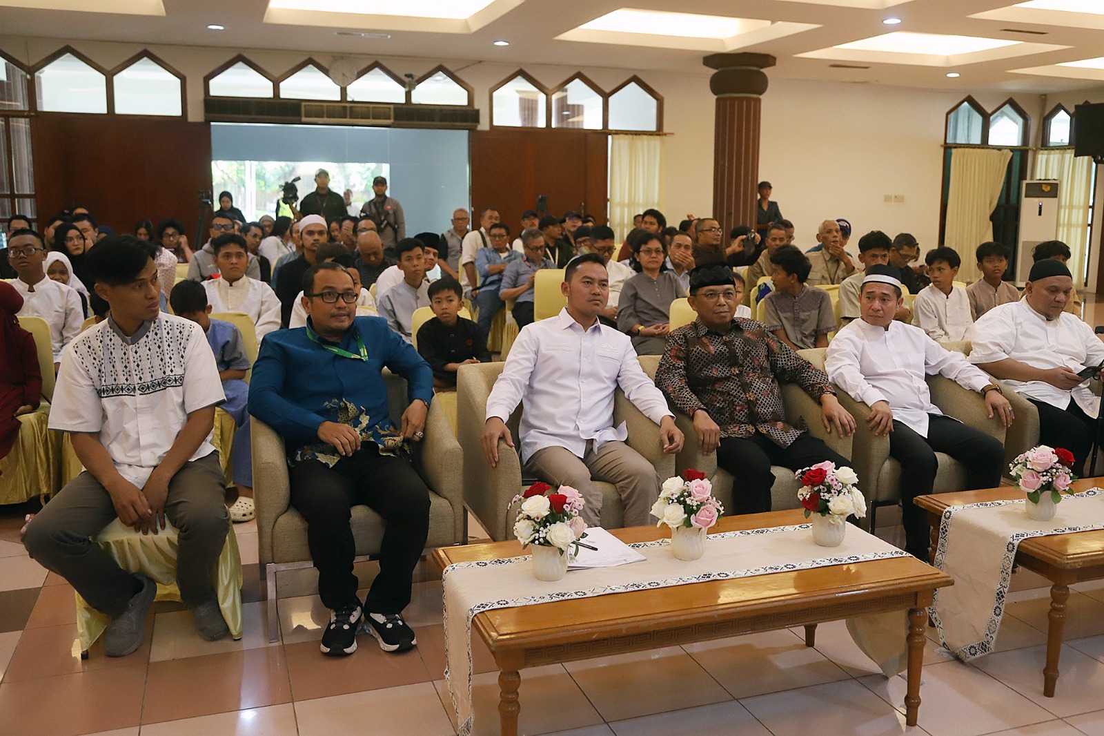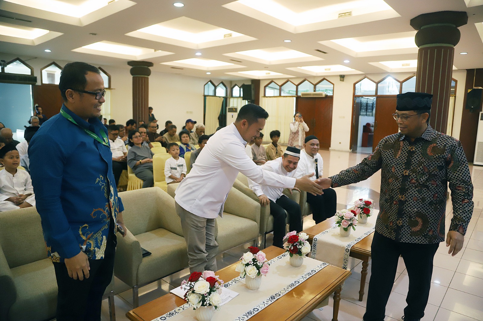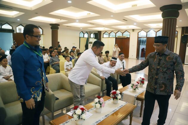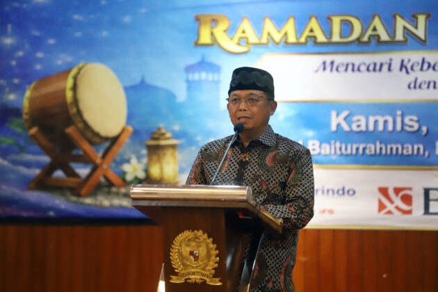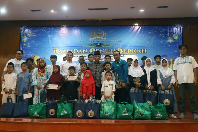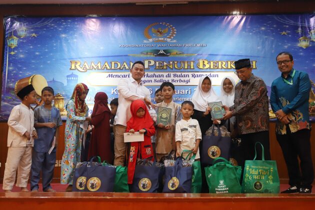 Anggota Komisi VI Fraksi Demokrat DPR RI, Herman Khaeron dan Ketua Koordinatoriat Wartawan Parlemen (KWP), Ariawan saat menghadiri acara penyerahkan santunan dan buka puasa bersama anak yatim piatu di Aula Masjid Baiturahman, Kompleks Parlemen, Jakarta, Kamis, (26/2/2026).