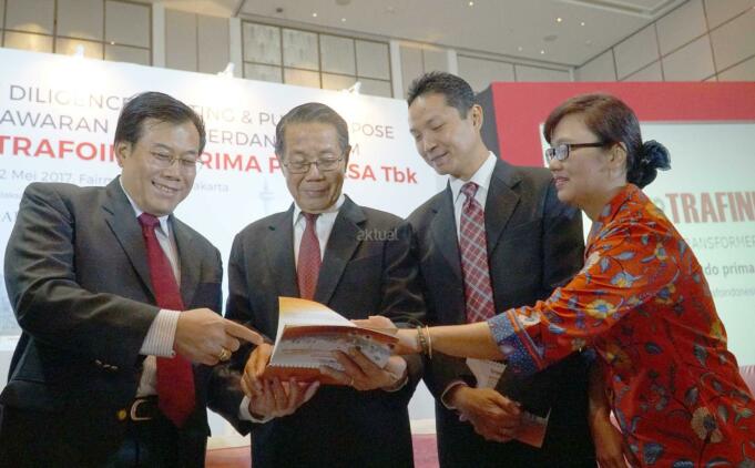 (dari kiri ke kanan) Direktur Pengadaan dan Hubungan Investor PT Trafoindo Prima Perkasa Tbk, Aries Teguhputra Hadiwidjojo, Deputi Direktur Utama, Hari Sapto, Direktur Utama, Suryono Limputra, Direktur Marketing, David Cahya Limputra, Direktur Independen, Suryati Karsono melihat materi presentasi Due Diligence Meeting & Public Expose di Jakarta, Senin (22/5). Sejumlah 1.201.628.000 lembar saham atau 16,67% dari enlarged capital dan setiap saham memiliki nilai nominal sebesar Rp 100 dengan kebijakan dividen sebanyak-banyaknya 50% dari total laba bersih tahun berjalan. Penjualan Bersih Trafoindo mencapai Rp 1,342 miliar, mengalami peningkatan dibandingkan dengan tahun 2015 yang hanya mencapai Rp 1,126 miliar. Laba Usaha di tahun 2016 sebesar Rp 215 miliar juga mengalami kenaikan bila dibandingkan dengan tahun 2015 yang mencapai Rp 189 miliar. Trafoindo optimis laba tersebut akan meningkat setiap tahunnya, mengingat Perseroan terus mengembangkan kualitas Produk dan meningkatkan pelayanannya. AKTUAL/Eko S Hilman