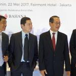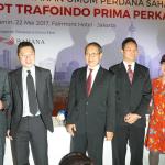 (dari kiri ke kanan), Komisaris Independen PT Trafoindo Prima Perkasa Tbk, Ngurah Adnyana, Komisaris Utama, Maximilian Widjaja, Direktur Utama, Suryono Limputra, Direktur Marketing,David Cahya Limputra berbincang seusai Due Diligence Meeting & Public Expose di Jakarta, Senin (22/5). Sejumlah 1.201.628.000 lembar saham atau 16,67% dari enlarged capital dan setiap saham memiliki nilai nominal sebesar Rp 100 dengan kebijakan dividen sebanyak-banyaknya 50% dari total laba bersih tahun berjalan. Penjualan Bersih Trafoindo mencapai Rp 1,342 miliar, mengalami peningkatan dibandingkan dengan tahun 2015 yang hanya mencapai Rp 1,126 miliar. Laba Usaha di tahun 2016 sebesar Rp 215 miliar juga mengalami kenaikan bila dibandingkan dengan tahun 2015 yang mencapai Rp 189 miliar. Trafoindo optimis laba tersebut akan meningkat setiap tahunnya, mengingat Perseroan terus mengembangkan kualitas Produk dan meningkatkan pelayanannya. AKTUAL/Eko S Hilman
