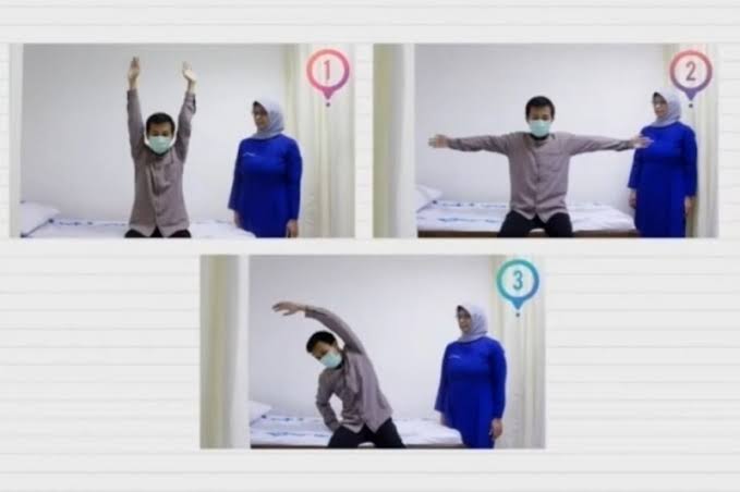Langkah berikutnya, latihan pengembangan dada ke arah samping kanan dan kiri secara bergantian sambil tarik napas. Caranya, tarik napas dan angkat tangan kanan ke atas lalu menyamping. Kemudian buang napas dan turunkan. Lakukan juga pada tangan kiri dan masing-masing diulang tiga kali atau sesuai dengan kemampuan pasien.