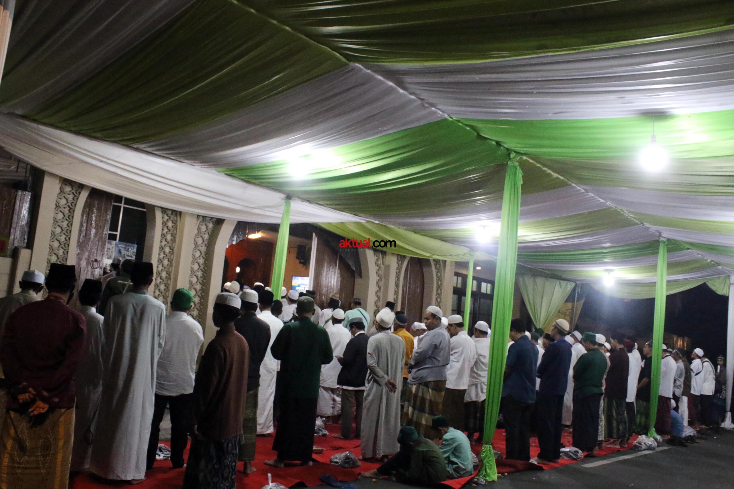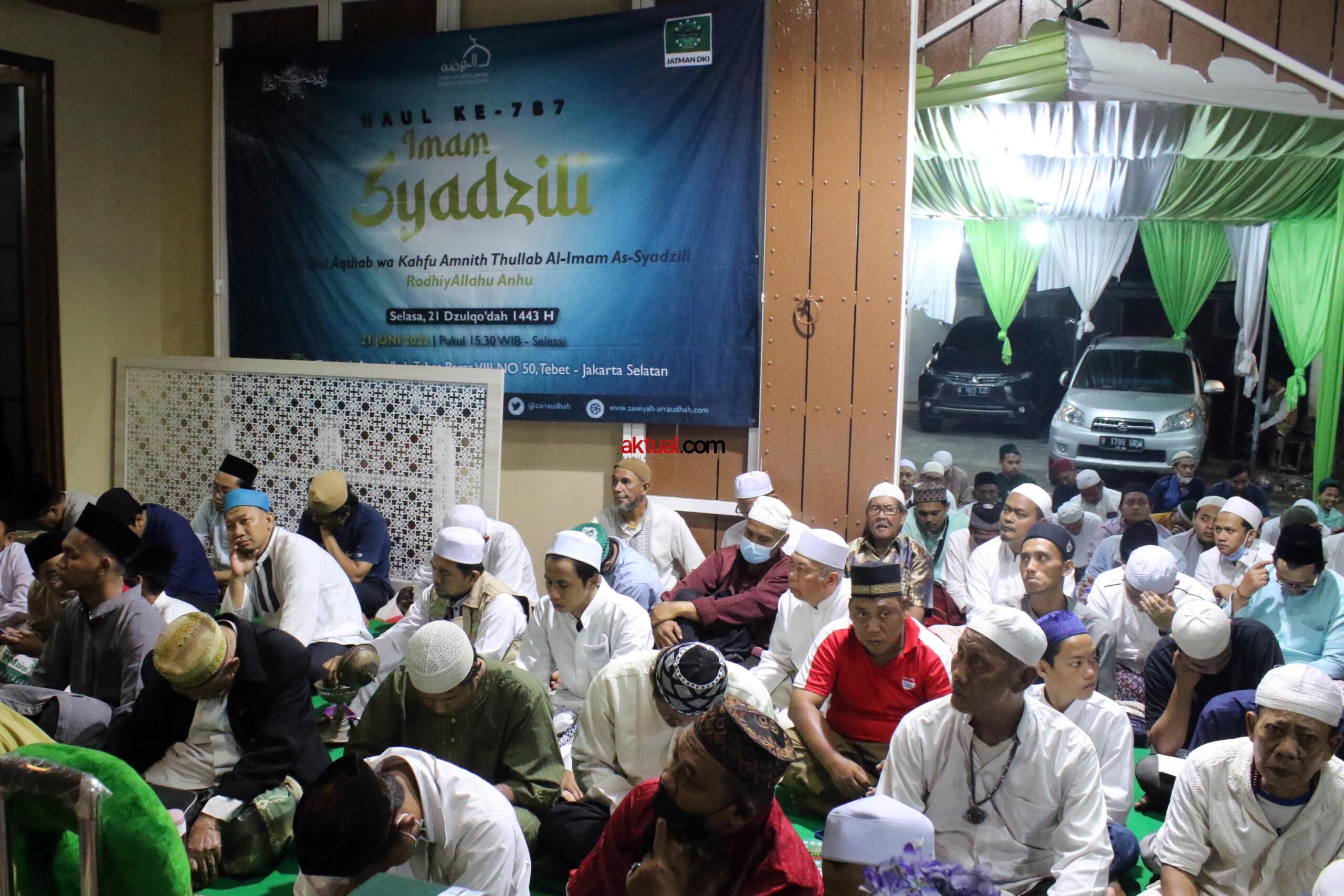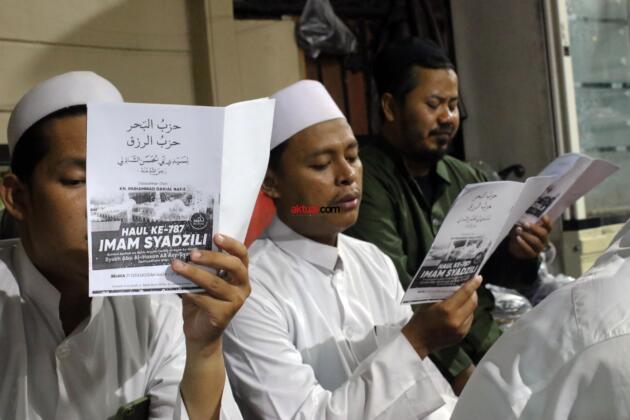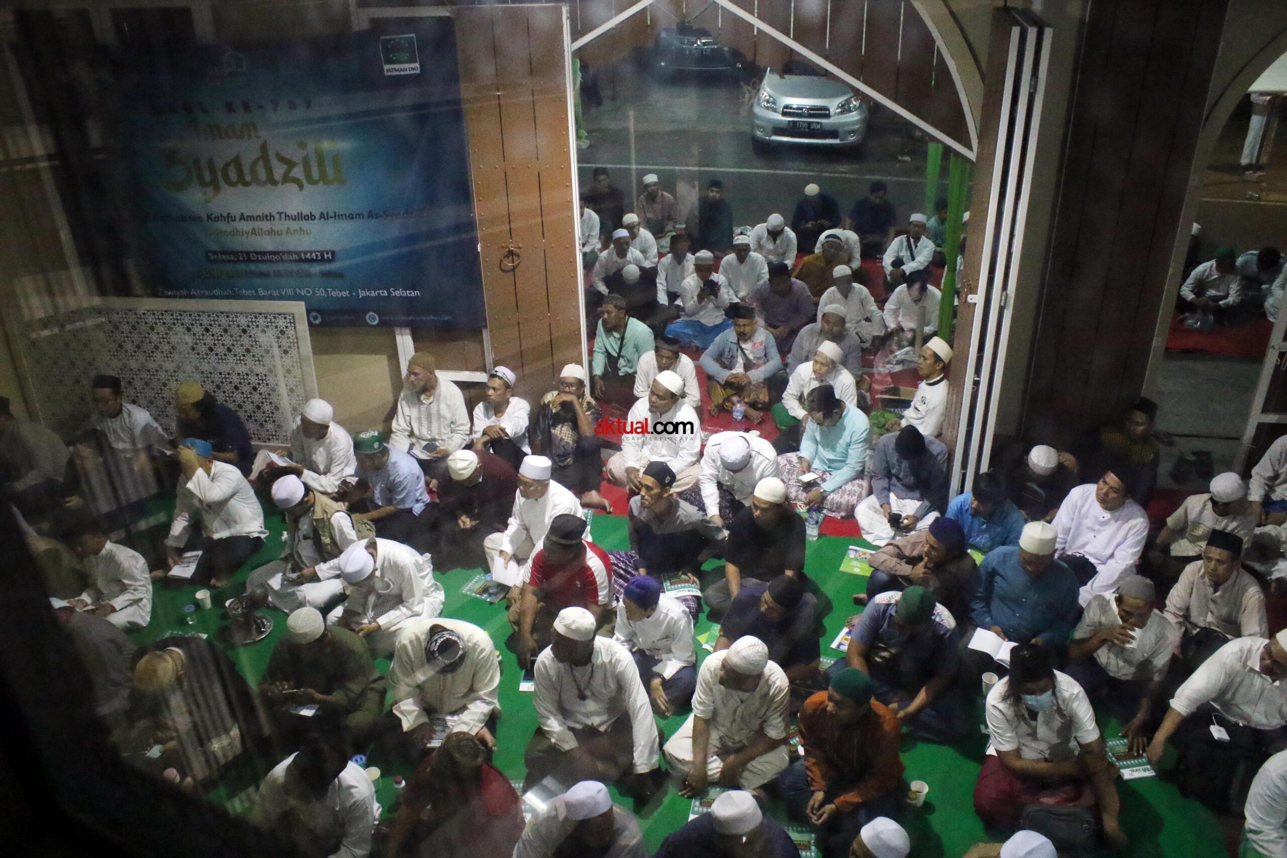 Ratusan jamaah ikhwan dan akhwat (laki-laki dan perempuan) juga turut memadati Markaz thariqoh Syadziliah. Acara diawali dengan khataman Al-Qur’an dan pembacaan Sholawat Dalailul Khoirot sebanyak 7 kali serta pembacaan Manaqib Imam As-Syadzili serta dilanjutkan dengan tausiyah, dzikir dan doa bersama. FOTO: AKTUAL / AHMAD WARNOTO.