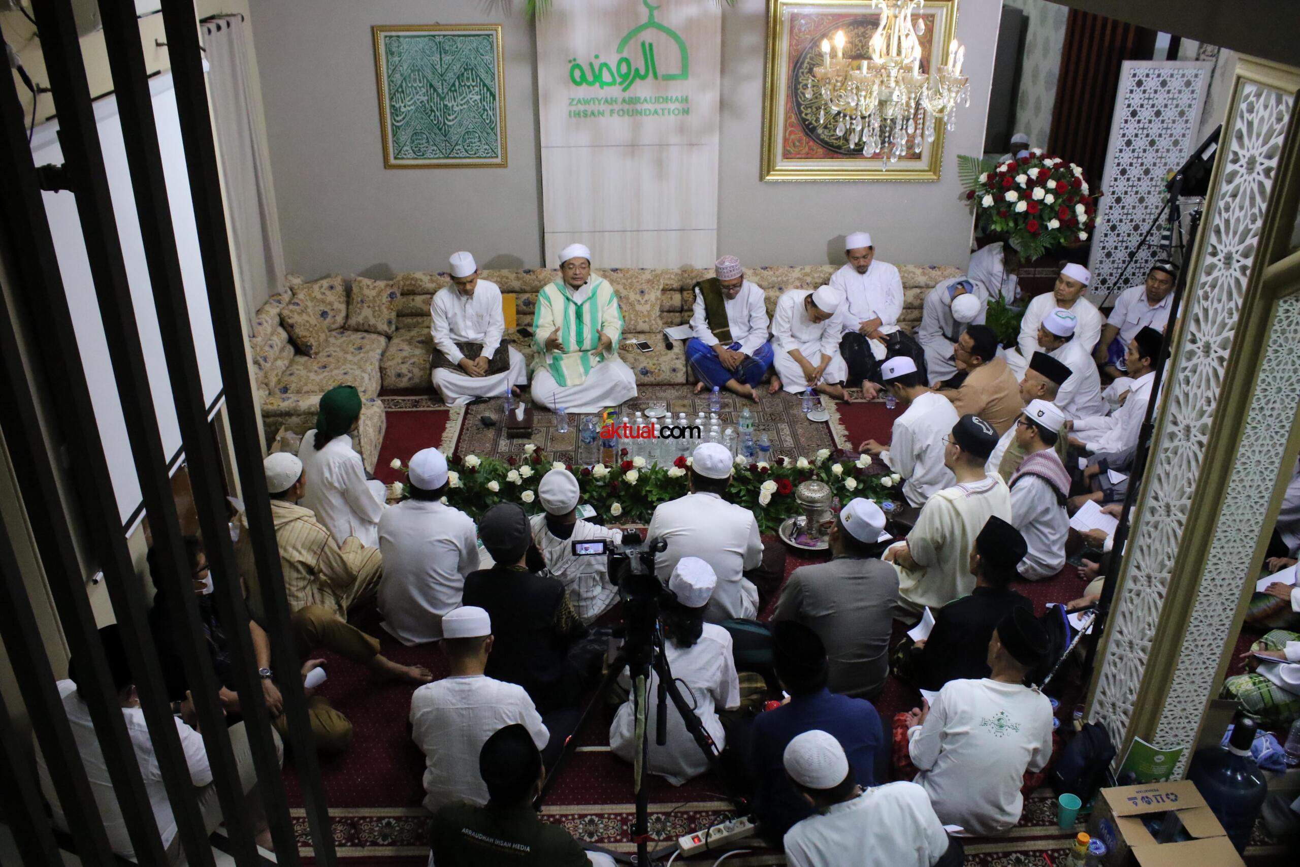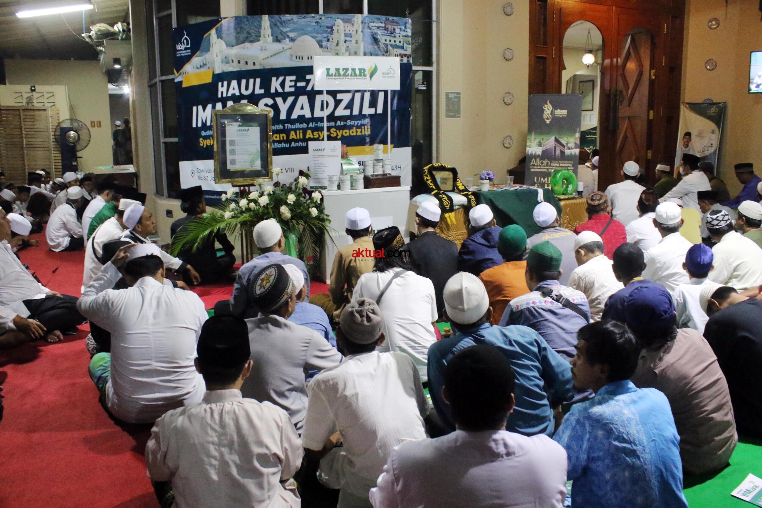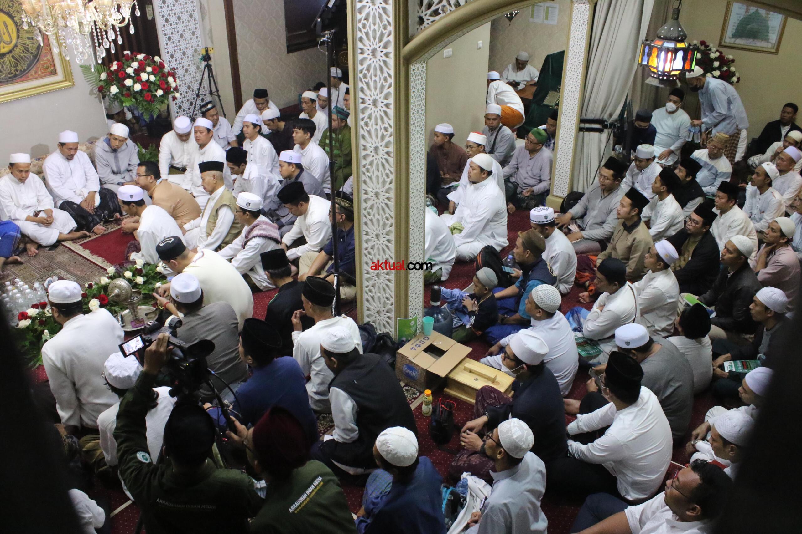 Ratusan jamaah ikhwan dan akhwat (laki-laki dan perempuan) juga turut memadati Markaz thariqoh Syadziliah. Acara diawali dengan khataman Al-Qur’an dan pembacaan Sholawat Dalailul Khoirot sebanyak 7 kali serta pembacaan Manaqib Imam As-Syadzili serta dilanjutkan dengan tausiyah, dzikir dan doa bersama. FOTO: AKTUAL / AHMAD WARNOTO.