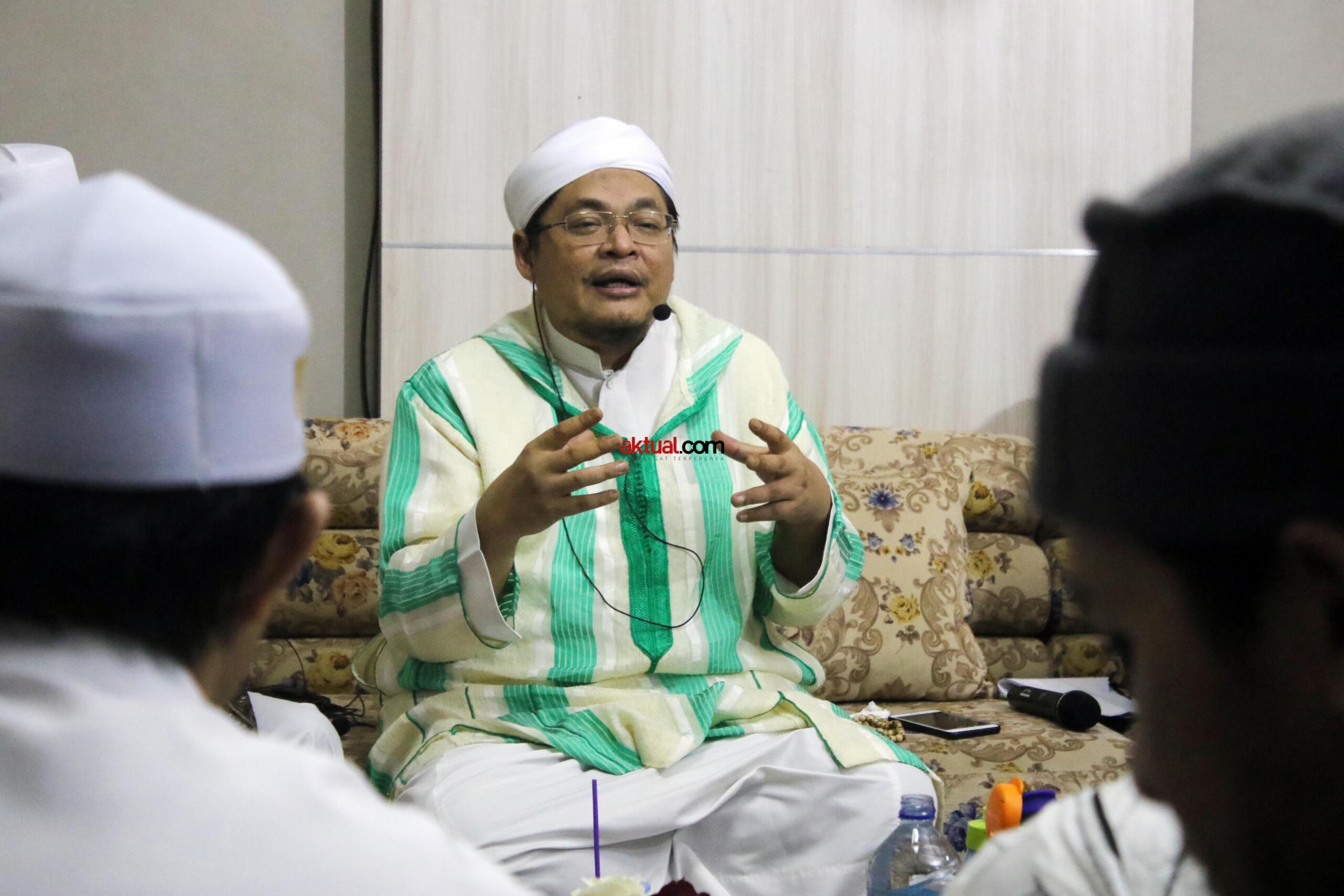 Khodim Zawiyah Arraudhah dan Mudir Jam’iyah Ahlut Thoriqoh Al-Mu’tabaroh An-Nahdliyah (JATMAN) DKI Jakarta, KH. Muhammad Danial Nafis saat memberikan tausiyah singkat sebelum memimpin doa dan dzikir bersama. FOTO: AKTUAL / AHMAD WARNOTO.
