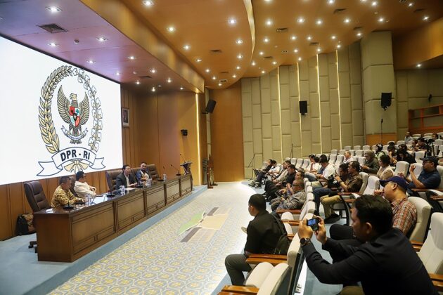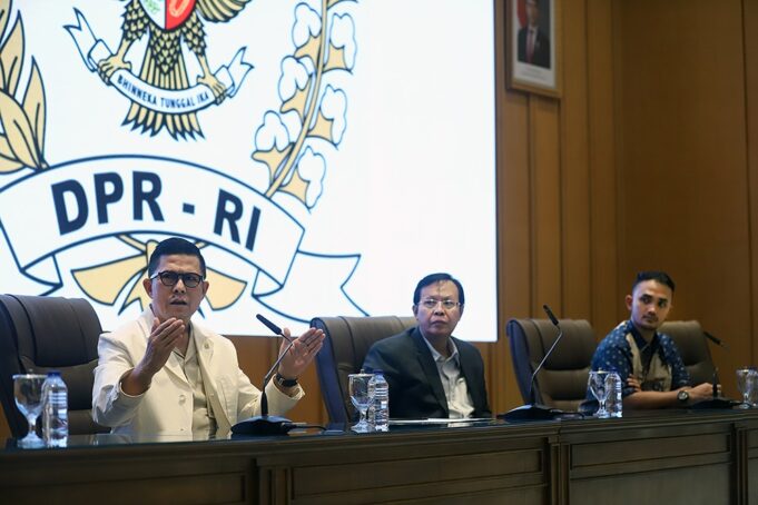 Anggota Komisi III DPR Fraksi Golkar Soedeson Tandra (kiri), Guru Besar Universitas Trisakti Trubus Rahardiansah (tengah) dan Ketua Umum Perhimpunan Mahasiswa Hukum Indonesia (PERMAHI) Azhar Sidiq (kanan), menjadi pembicara dalam Diskusi Dialektika Demokrasi, di Ruang Abdul Muis, Gedung Nusantara, Kompleks Parlemen, Senayan, Jakarta, Kamis (12/2/2026).