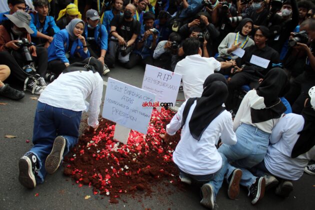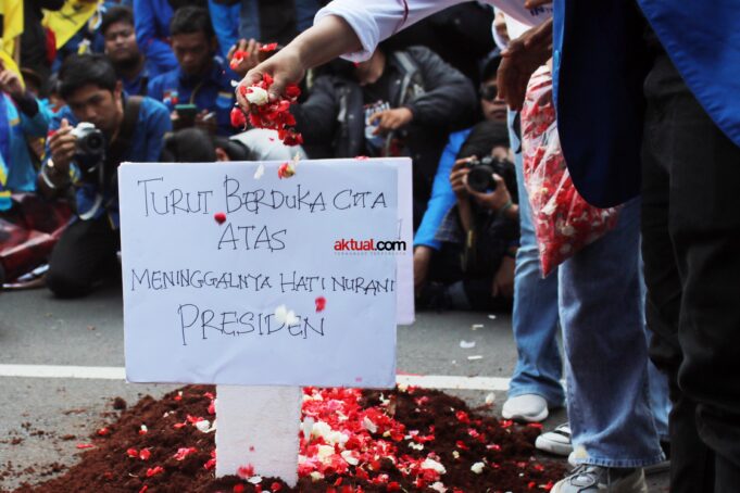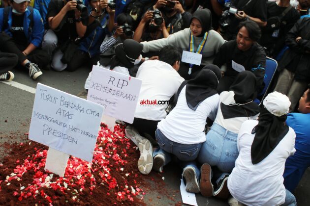 Aksi teatrikal sebagai gambaran yang menunjukan matinya hati nurani pemerintah dalam membuat kebijakan yang menyangkut hajat hidup masyarakat. Foto: Aktual / Ahmad Warnoto.
