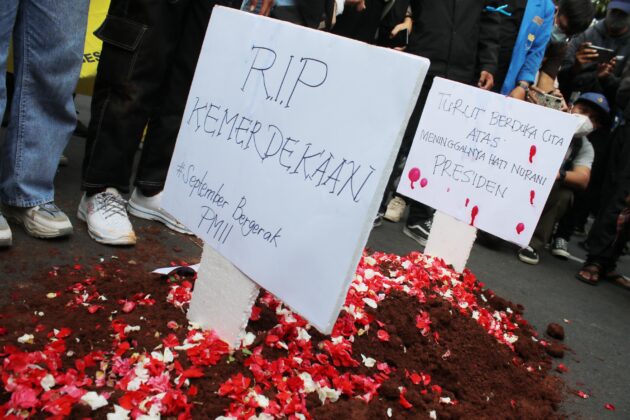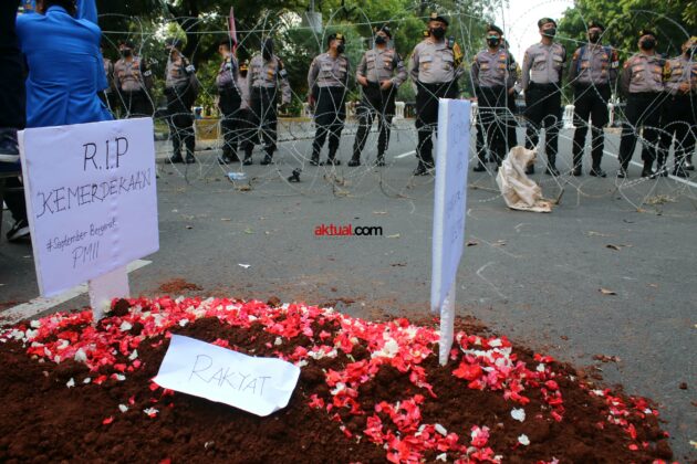 para lakon membuat sebuah gundukan tanah menyerupai pemakaman dengan nisan bertuliskan "RIP Kemerdekaan #September Bergerak PMII". Foto: Aktual / Ahmad Warnoto.