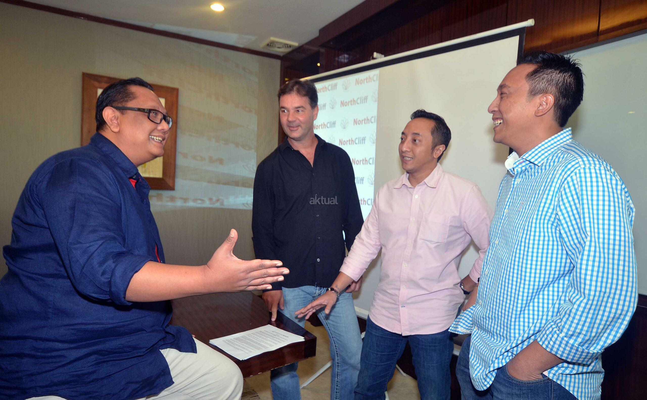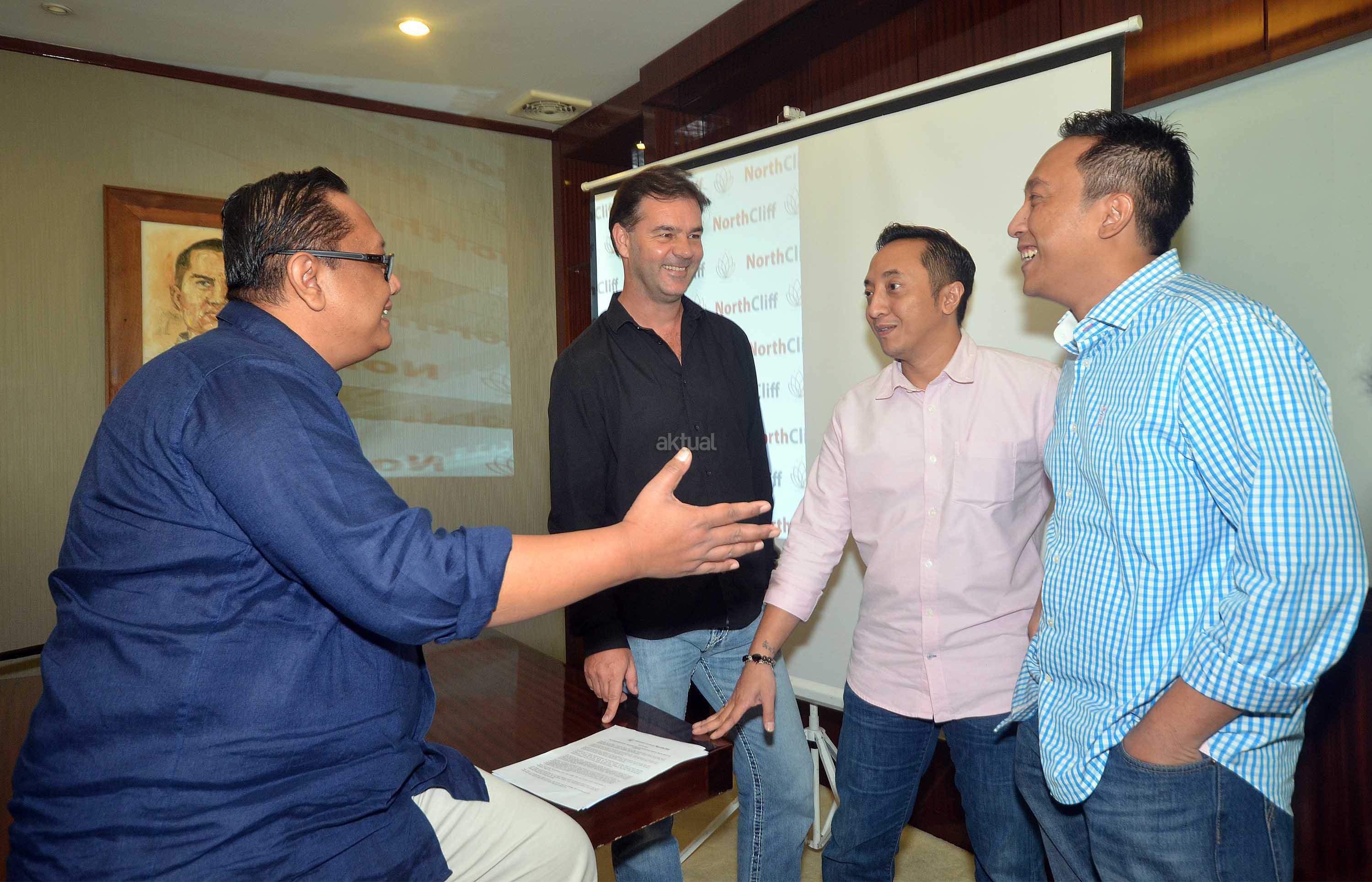 Founder and Managing Director NorthCliff Capital Pte.Ltd Erry Sulistio (kiri), Founder and Director Made Arie Wibawa (kanan) dan Director Gede Arie Soetedja (kedua kanan), berbincang dengan Founder & CEO delMango and delOne Seminyak Bali, Ronny Tome, disela pengumuman rencana investasi properti dengan PT Ratu Prabu Energi Tbk, di Jakarta, Rabu (1/6). NorthCliff, perusahaan investasi yang fokus pada pembiayaan properti, minyak dan gas, mineral, serta infrastruktur, berafiliasi dengan PT Simasindo Intitama, menargetkan dalam 5 tahun kedepan dapat menjadi "Private Equity" tidak saja di Indonesia melainkan juga mancanegara.NorthCliff menyiapkan dana US$200 juta untuk membiayai proyek properti dan oil & gas milik ARTI. Sebagai gambaran, perusahaan investasi yang didirikan 5 tahun lalu ini untuk saat ini masih berfokus pada pembiayaan properti, minyak dan gas, mineral, serta infrastruktur. Aktual.news/Eko S Hilman