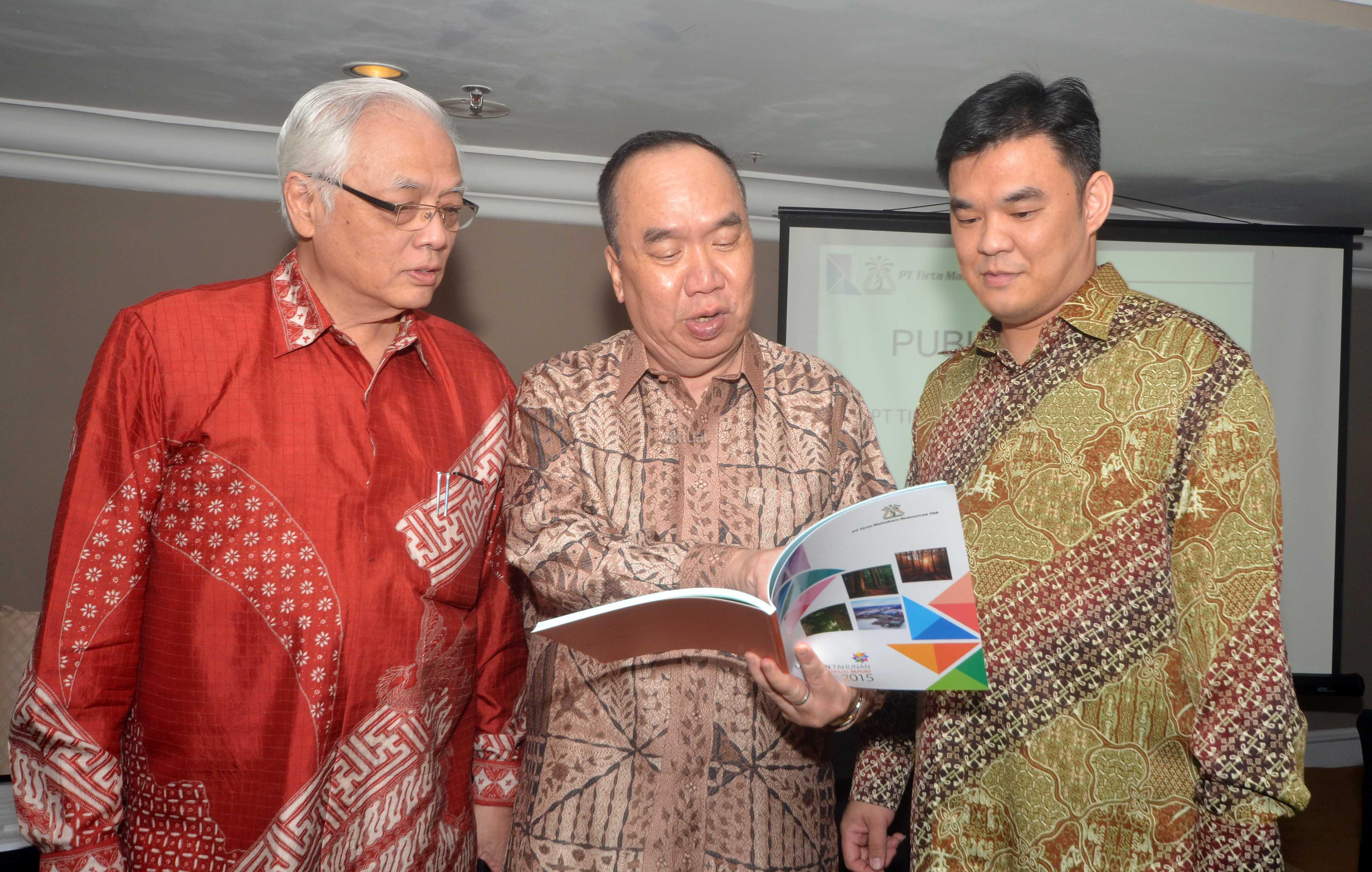 Direktur Utama PT Tirta Mahakam Resources Tbk (TIRTA), Djohan Surja Putra (tengah ) berbincang Komisaris Independen TIRTA , Pohan Wijaya Po (kanan) disaksikan Direktur Independen TIRTA, Alan Budihardja Surya Atmadja (kiri)sesaat sebelum Rapat Umum Pemegang Saham Tahunan di Jakarta, Jumat (3/6).PT Tirta Mahakam Resources Tbk (TIRTA) mengelar Rapat Umum Pemegang Saham Tahunan dan Paparan Publi. Laba Usaha Tirta sebesar Rp 32 miliar pada kuartal I-2016 lalu, atau naik 28% dibanding di kuartal I-2015. Penjualan mencapai Rp 234 miliar dan laba sebelum pajak tercatat sebesar Rp 42 miliar pada kuartal I-2016. Tirta tidak membagikan dividen untuk tahun buku 2015 dalam RUPST yang akan digunakan untuk memperkuat permodalan Tirta sambil terus melakukan peningkatan penjualan pada tahun 2016 ke depan. Aktual.news/Eko S Himan