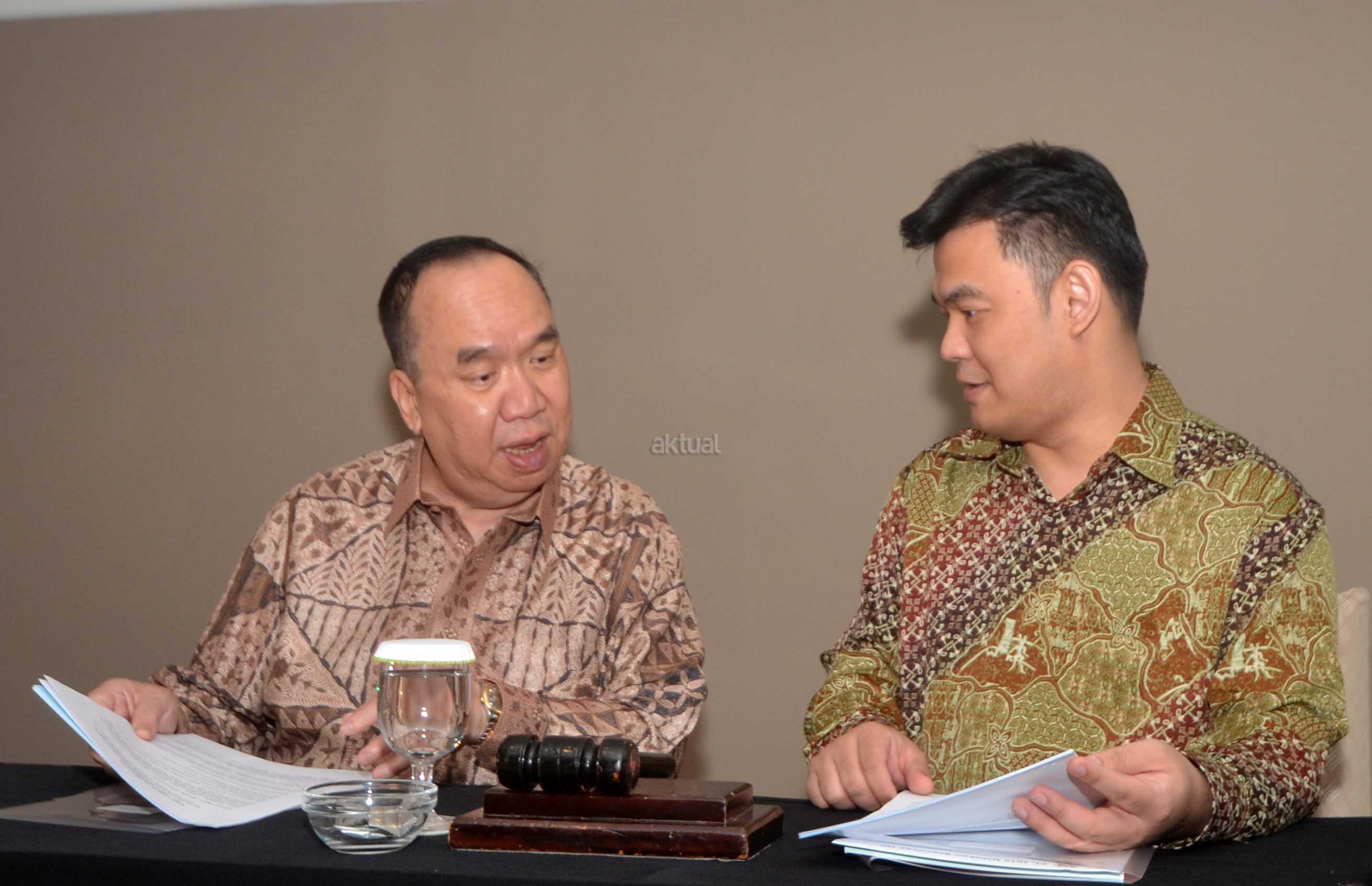Direktur Utama PT Tirta Mahakam Resources Tbk (TIRTA), Djohan Surja Putra (kiri) berbincang dengan Komisaris Independen TIRTA , Pohan Wijaya Po sesaat sebelum Rapat Umum Pemegang Saham Tahunan di Jakarta, Jumat (3/6). Laba Usaha Tirta sebesar Rp 32 miliar pada kuartal I-2016 lalu, atau naik 28% dibanding di kuartal I-2015. Penjualan mencapai Rp 234 miliar dan laba sebelum pajak tercatat sebesar Rp 42 miliar pada kuartal I-2016. Tirta tidak membagikan dividen untuk tahun buku 2015 dalam RUPST yang akan digunakan untuk memperkuat permodalan Tirta sambil terus melakukan peningkatan penjualan pada tahun 2016 ke depan. Aktual.news/Eko S Hilman