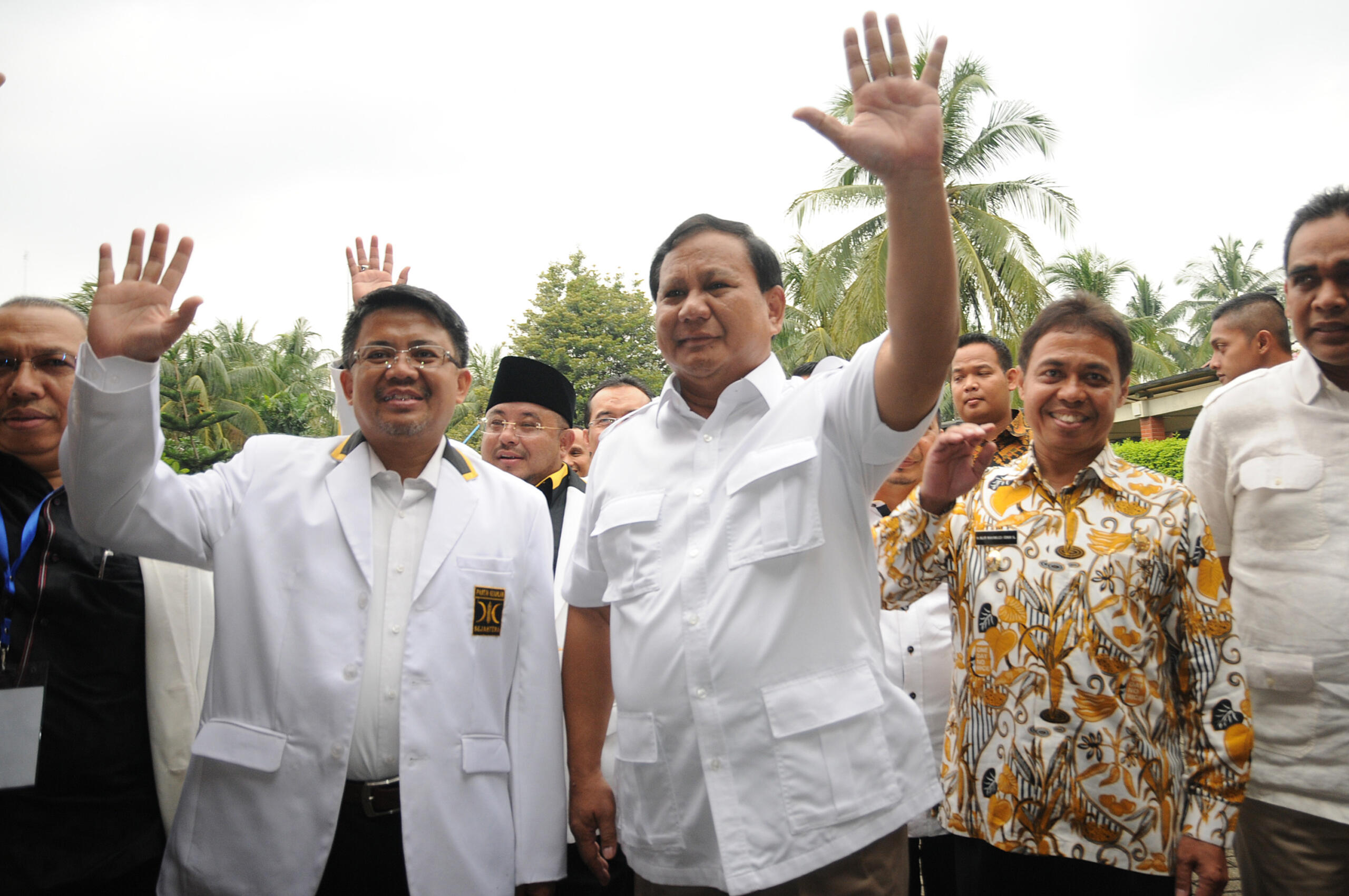 Ketua Umum Partai Gerindra Prabowo Subianto (kedua kiri) melambaikan tangan bersama Presiden Partai Keadilan Sejahtera (PKS) Mohamad Sohibul Iman (kiri) dan Walikota Depok Nur Mahmudi Ismail (kedua kanan) saat menghadiri Rakornas PKS di Depok, Jawa Barat, Selasa (12/1). Rakornas PKS diantaranya membahas tupoksi, program strategis serta rencana kegiatan dan anggaran tahunan (RKAT) 2016. ANTARA FOTO/Indrianto Eko Suwarso/ama/16