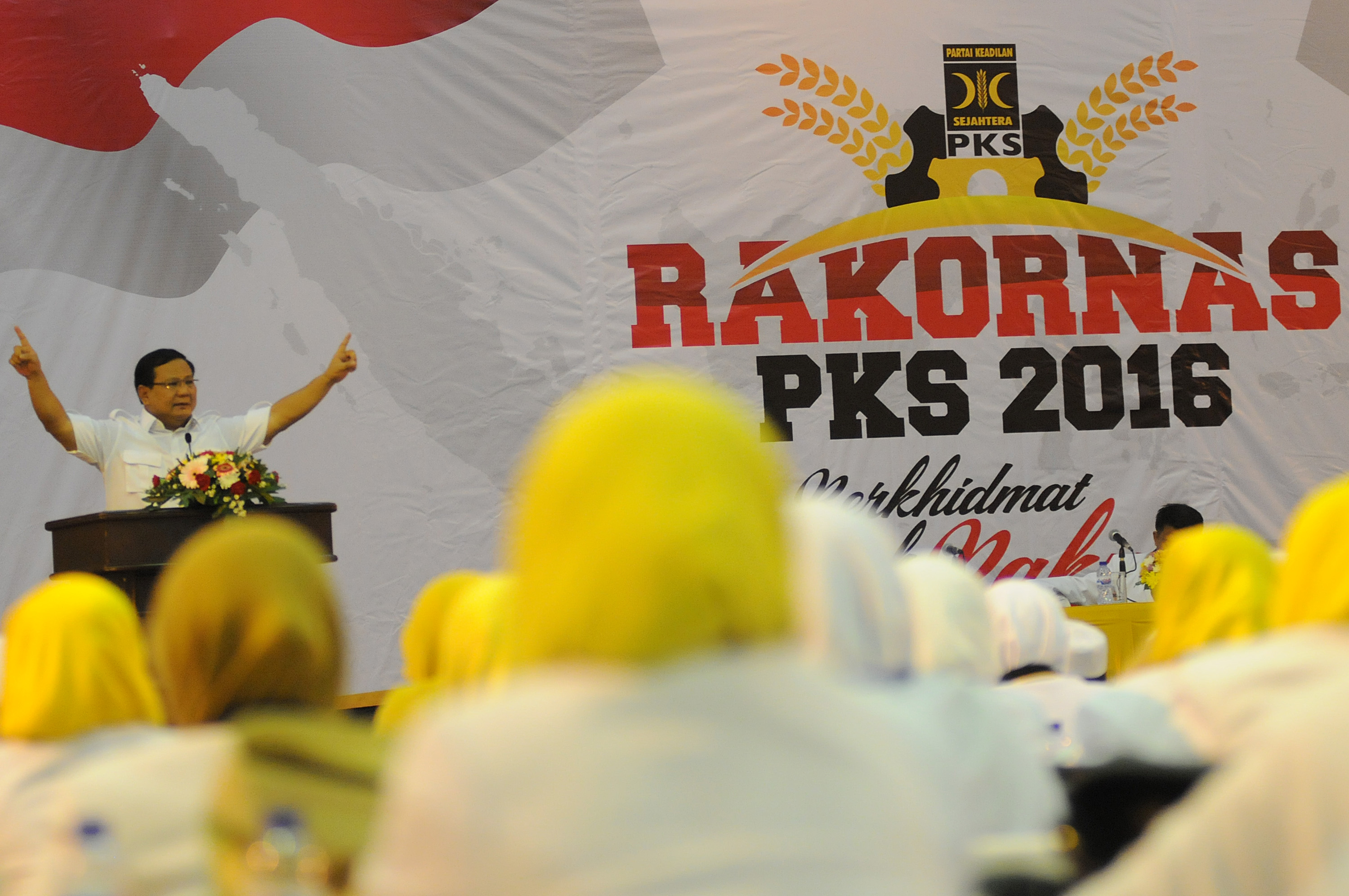 Ketua Umum Partai Gerindra Prabowo Subianto (kiri) menyampaikan pidato tentang kepemimpinan di hadapan kader PKS saat Rakornas PKS di Depok, Jawa Barat, Selasa (12/1). Rakornas PKS diantaranya membahas tupoksi, program strategis serta rencana kegiatan dan anggaran tahunan (RKAT) 2016. ANTARA FOTO/Indrianto Eko Suwarso/ama/16