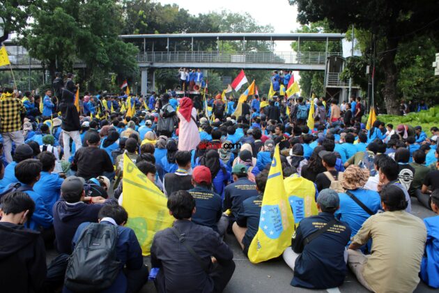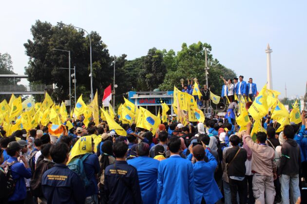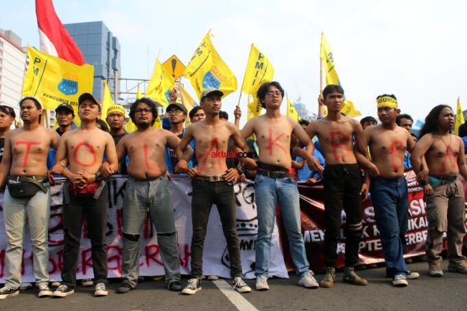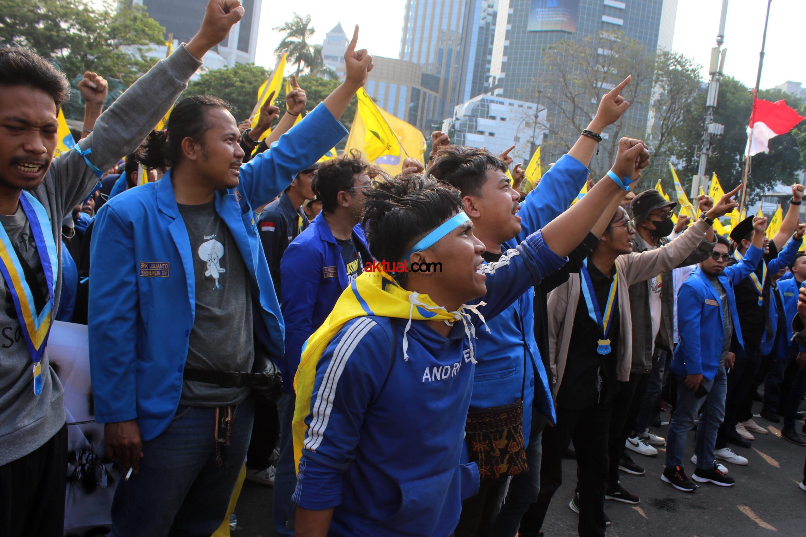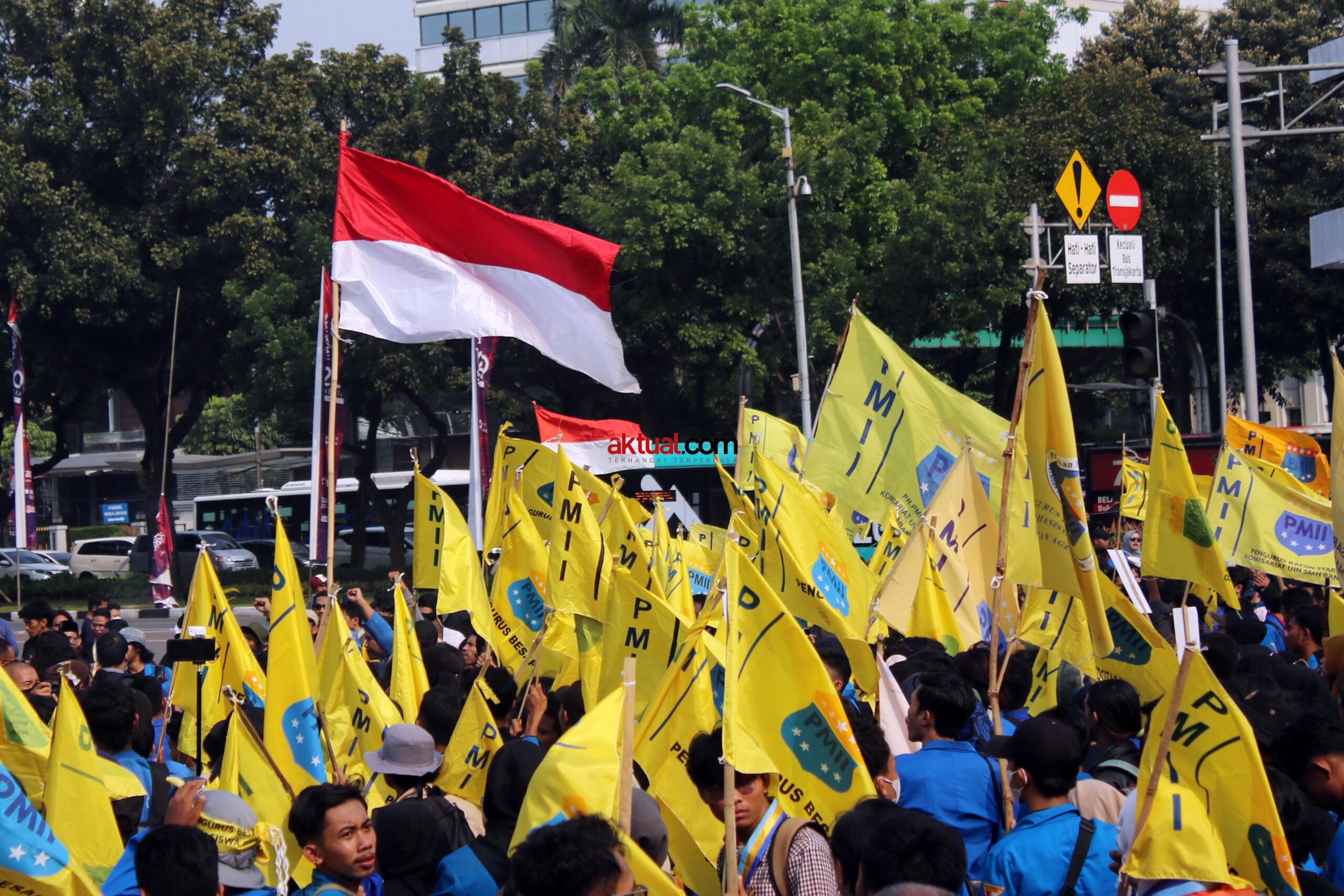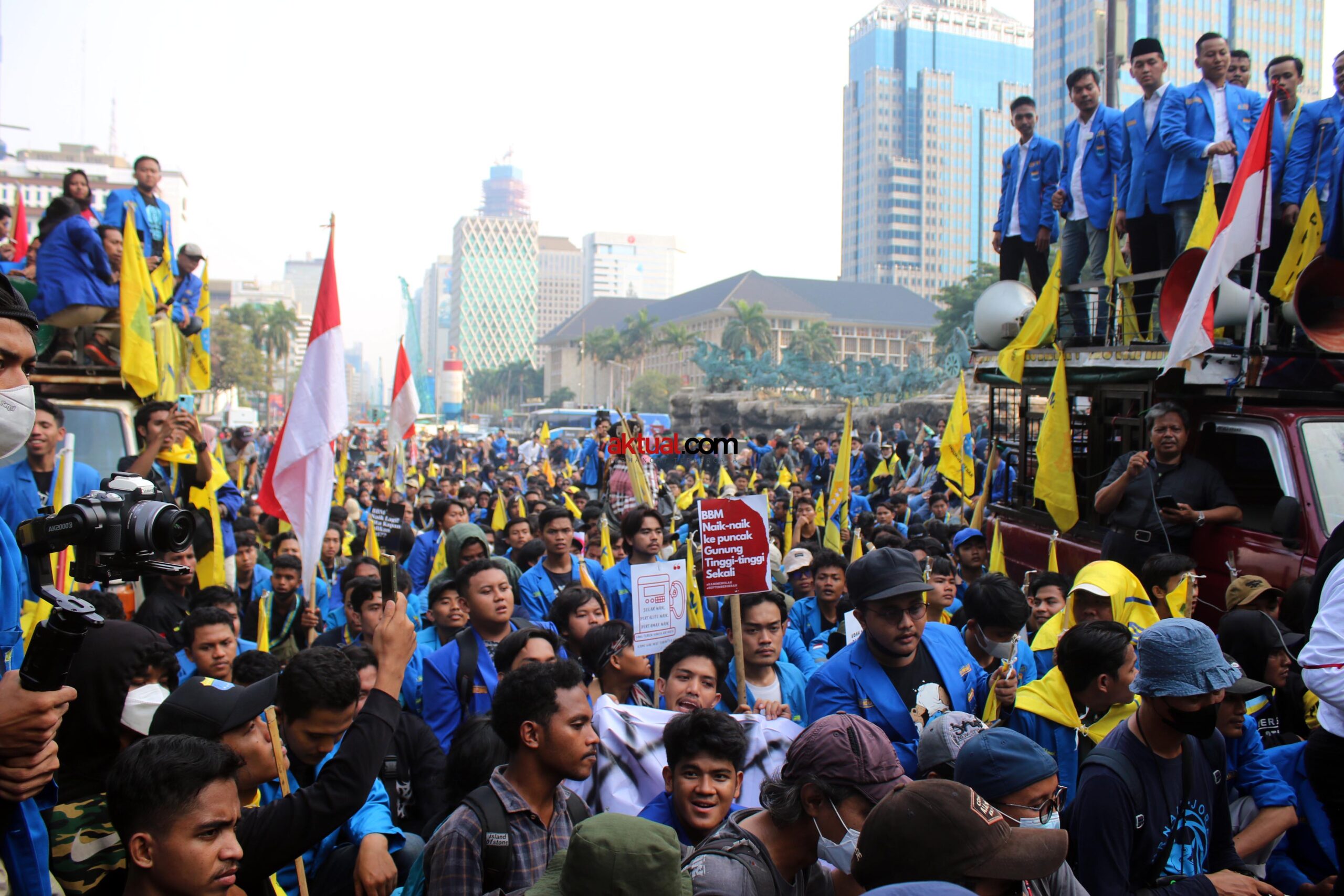 Seribuan mahasiswa yang tergabung dalam Pergerakan Mahasiswa Islam Indonesia (PMII) melakukan aksi unjuk rasa menolak kenaikan bahan bakar minyak (BBM) di depan Istana Negara, Jakarta Pusat. Foto: Aktual / Ahmad Warnoto.