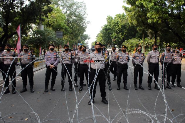 Sejumlah aparat kepolisian yang bertugas untuk mengawal jalannya aksi unjuk rasa. Foto: Aktual / Ahmad Warnoto.