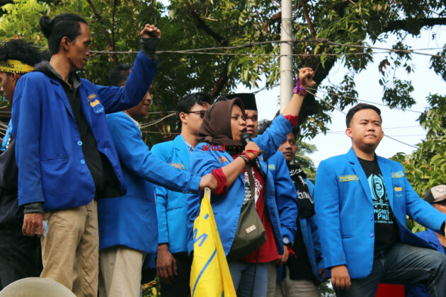 Sejumlah orator dari Pergerakan Mahasiswa Islam Indonesia (PMII) di atas mobil komando saat gelar aksi unjuk rasa tolak kenaikan BMM di depan Istana Negara, Jakarta. Foto: Aktual / Ahmad Warnoto.
